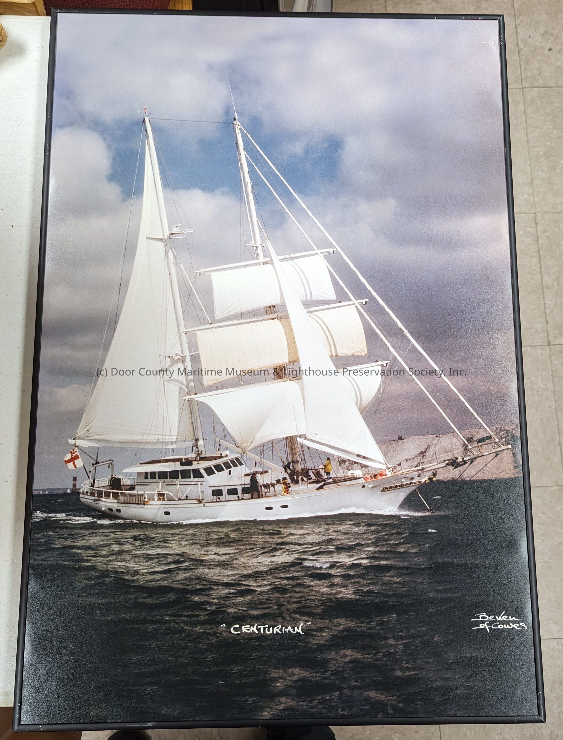 Image of royal sailing squadron Centurion at full sail in front of white cliffs. "Centurian Beren of Cowes" on bottom of imageLocation