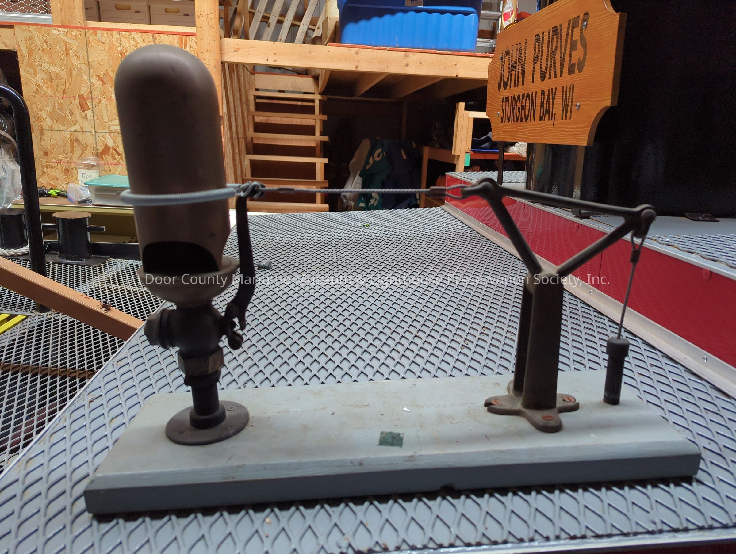 Mounted on grey wooden board. Metal whistle. Pulley and whistle
