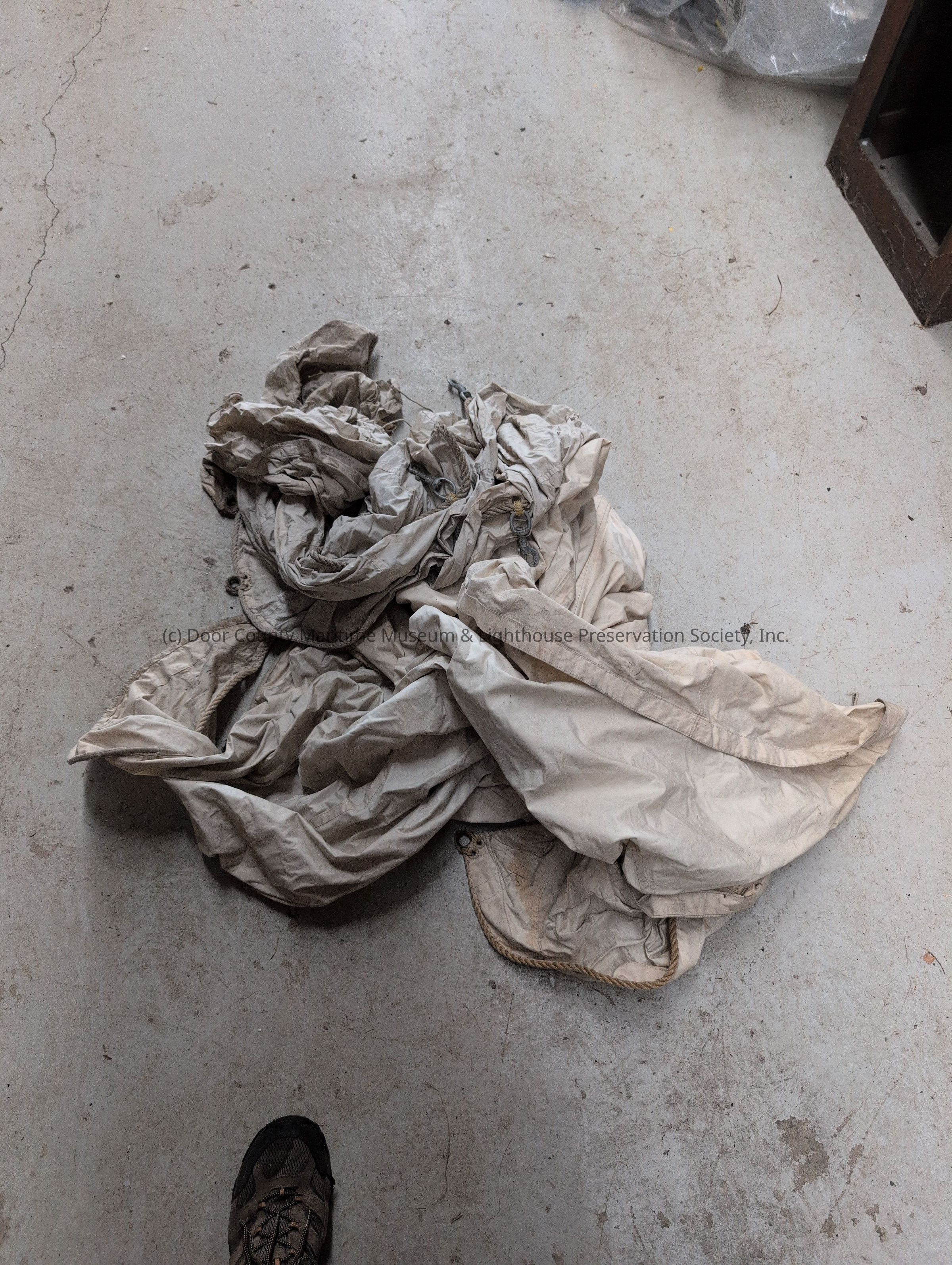 Eggshell colored sail. Qnomets, ropes, and guides on one edge