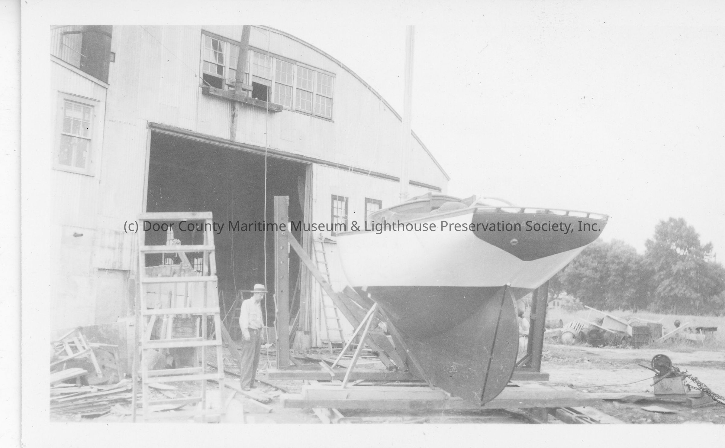 Sailboat Marcla II in cribbing at Peterson Boat Works 1938