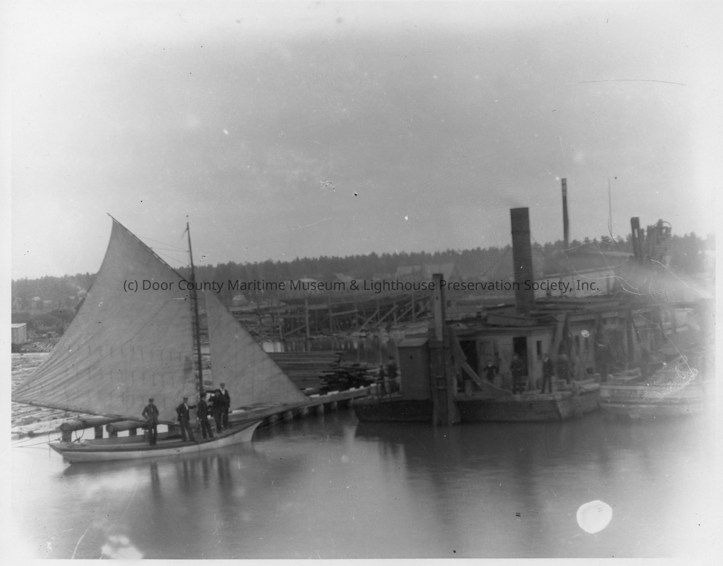 Sailing vessel at left with five men standing on deck