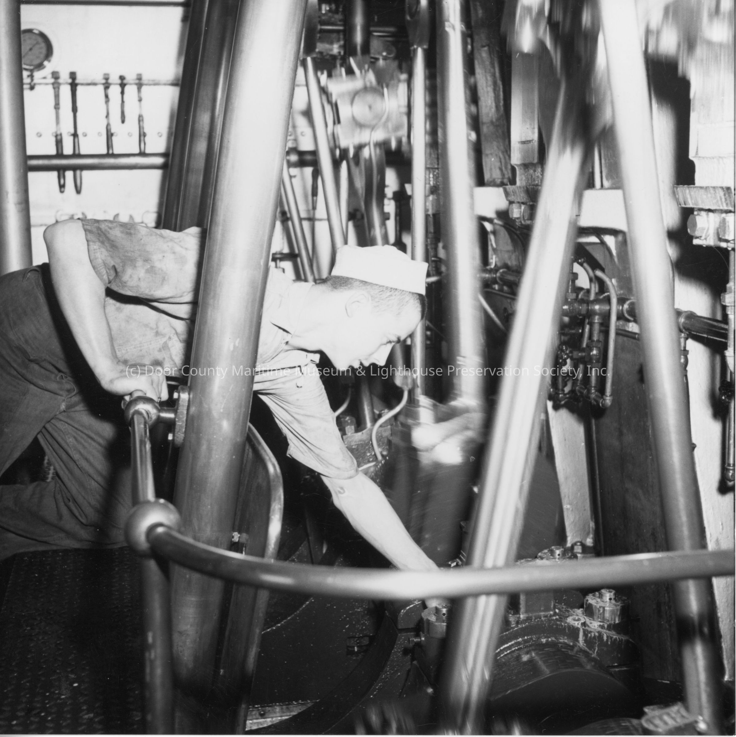Engine of the lighthouse tender Hollyhock. Sailor working on engineLocation
