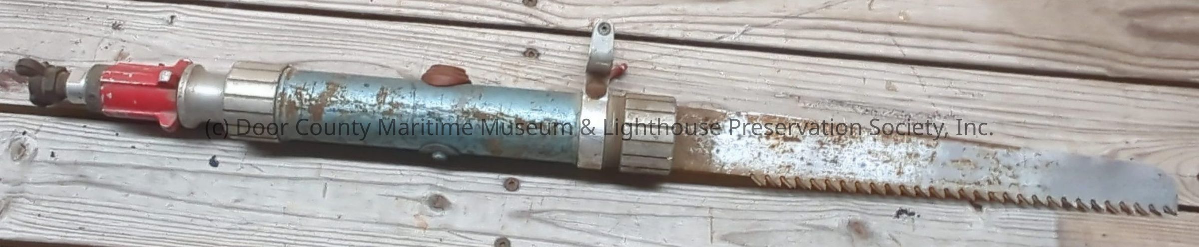 Tarnished silver blade with teeth. Blue cylindrical part in center with silver at each end. Silver handle. Brown rudder cap in center of blue part. red lever on center