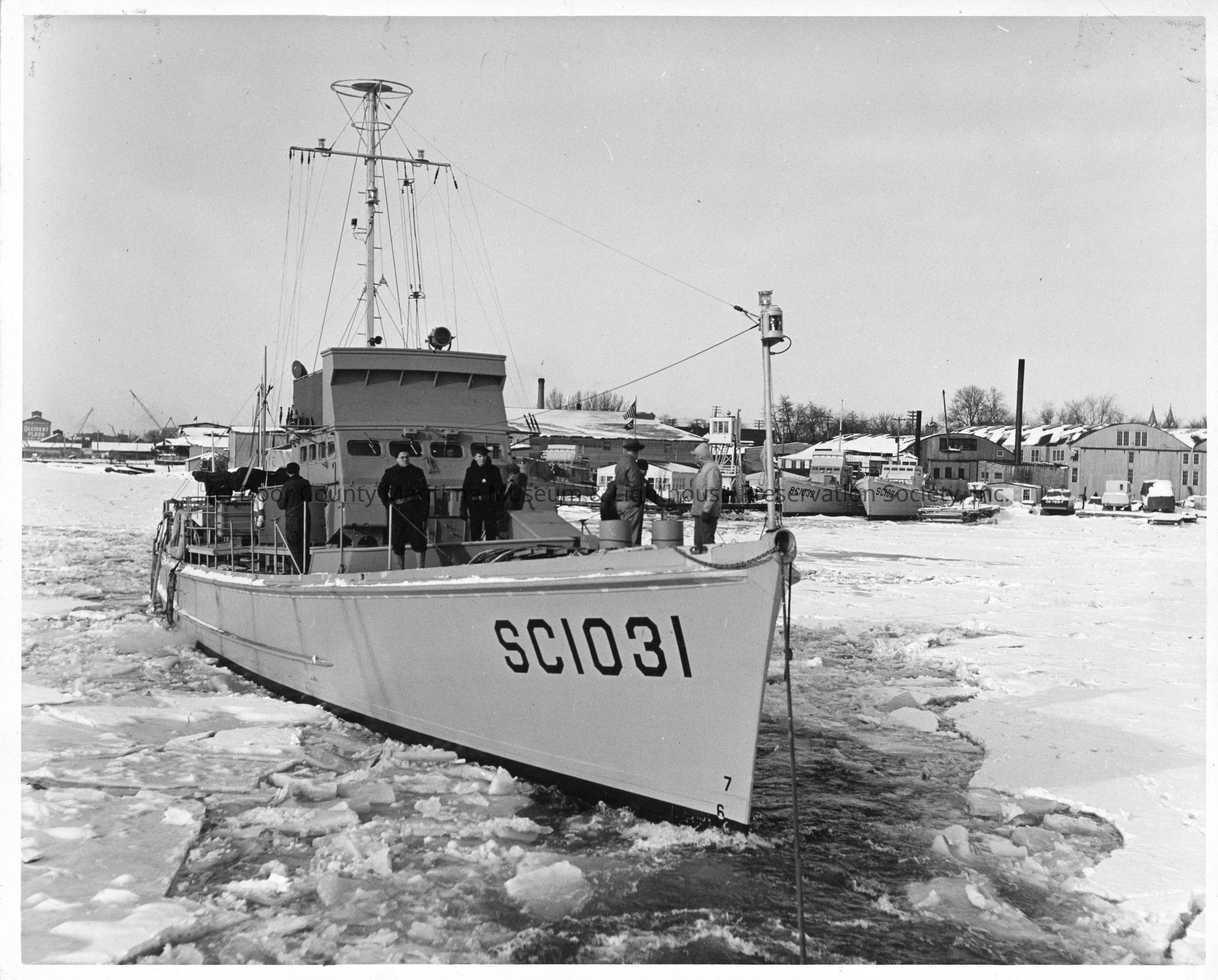 SC-1031 being towed in icy water with SC-1033 and SC-1034 docked in background at Peterson Boat WorksEntry/Object ID