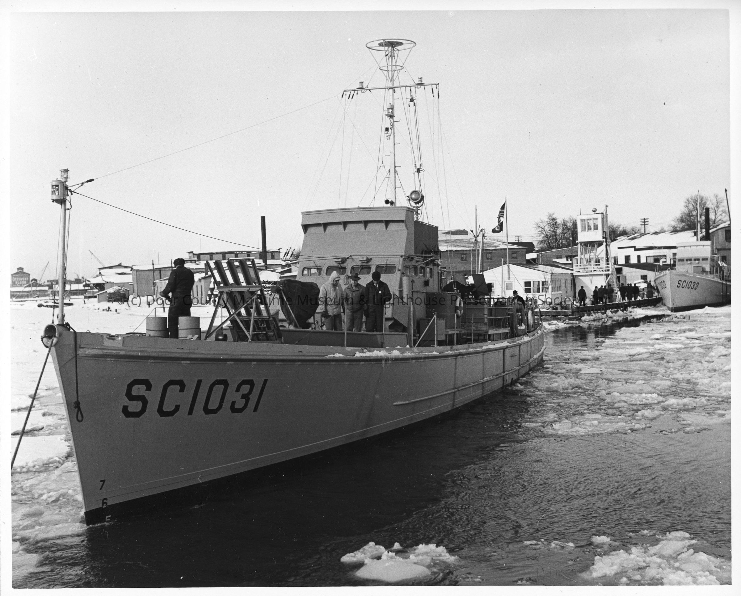 SC-1031 being towed through icy water with SC-1033 docked in background at Peterson Boat WorksEntry/Object ID