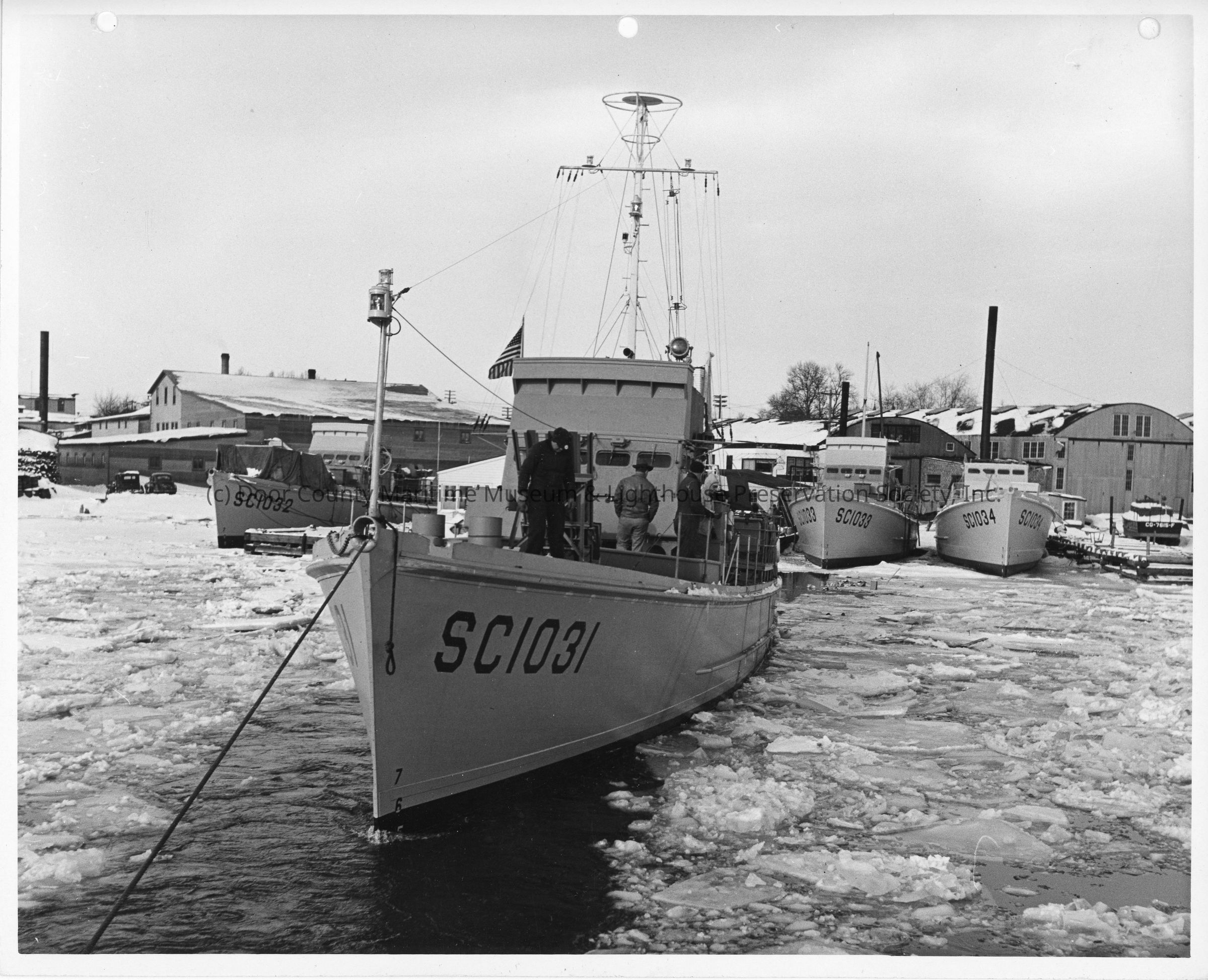 SC-1031 being towed with SC-1032, SC-1033, and SC-1034 in background at Peterson Boat Works January 6, 1943Entry/Object ID