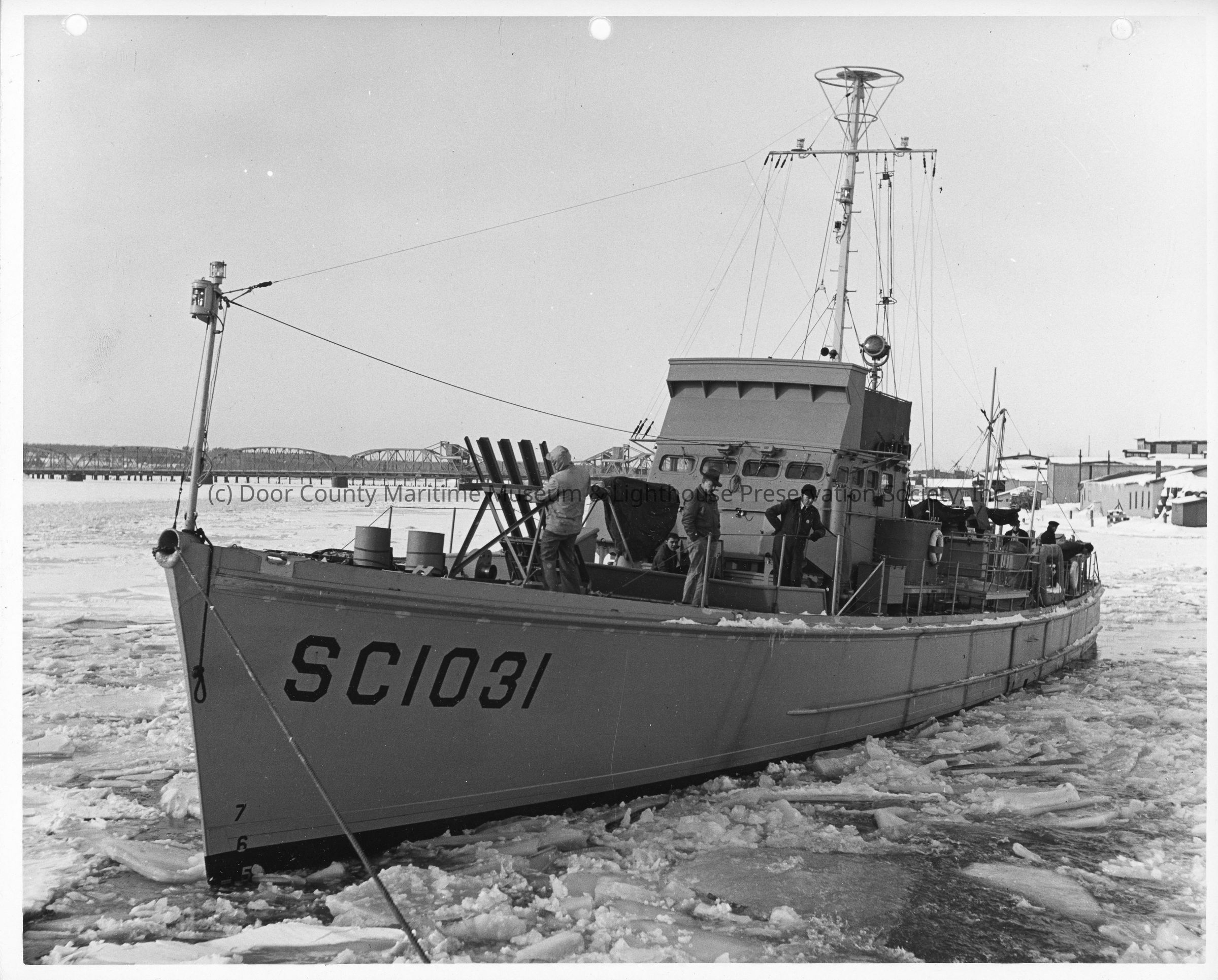 SC-1031 tied down in icy water in the Bay of Sturgeon Bay January 6, 1943