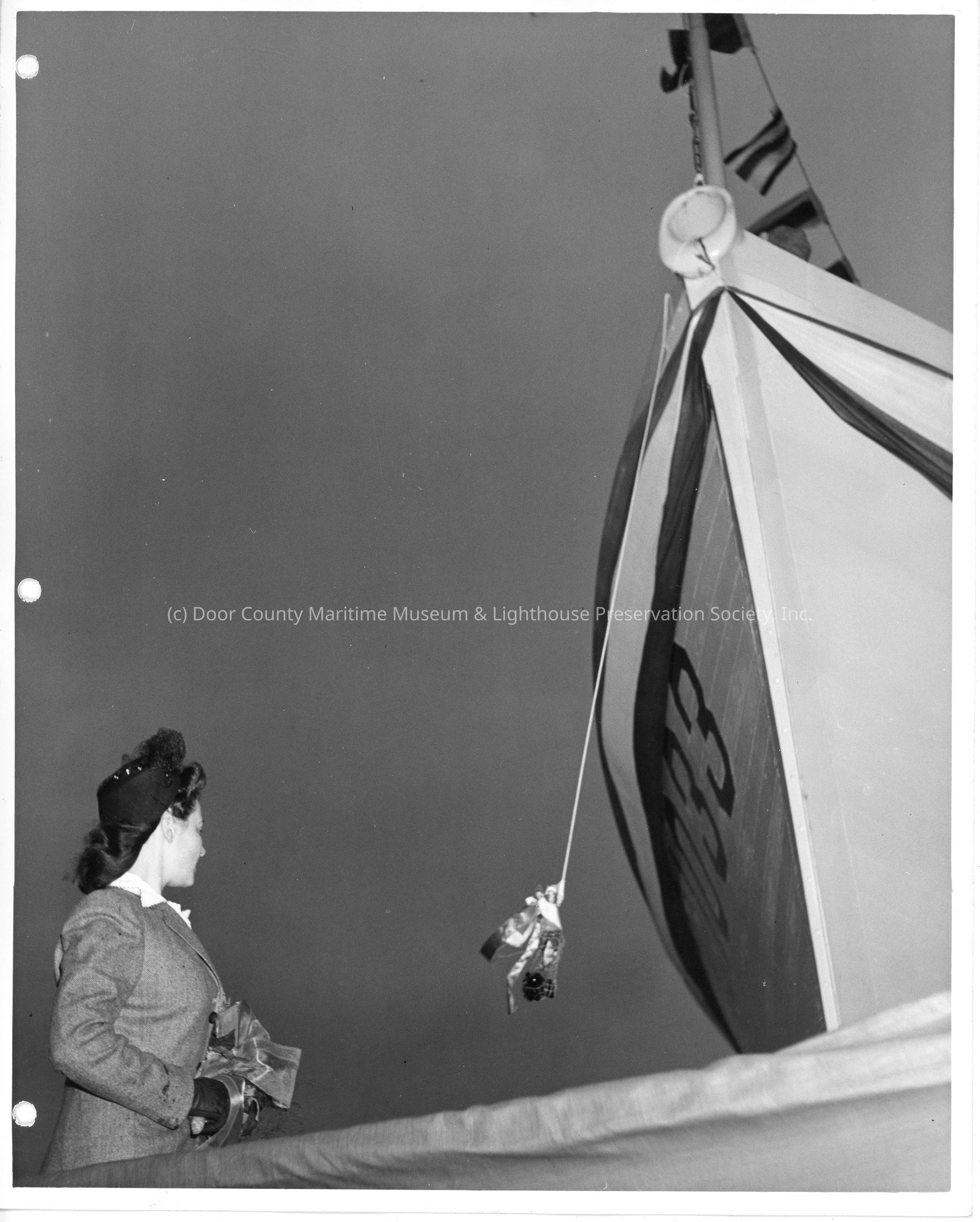 SC-1033 ship sponsor holding flowers with christening bottle dangling post-christening at Peterson Boat Works November 5, 1942Entry/Object ID