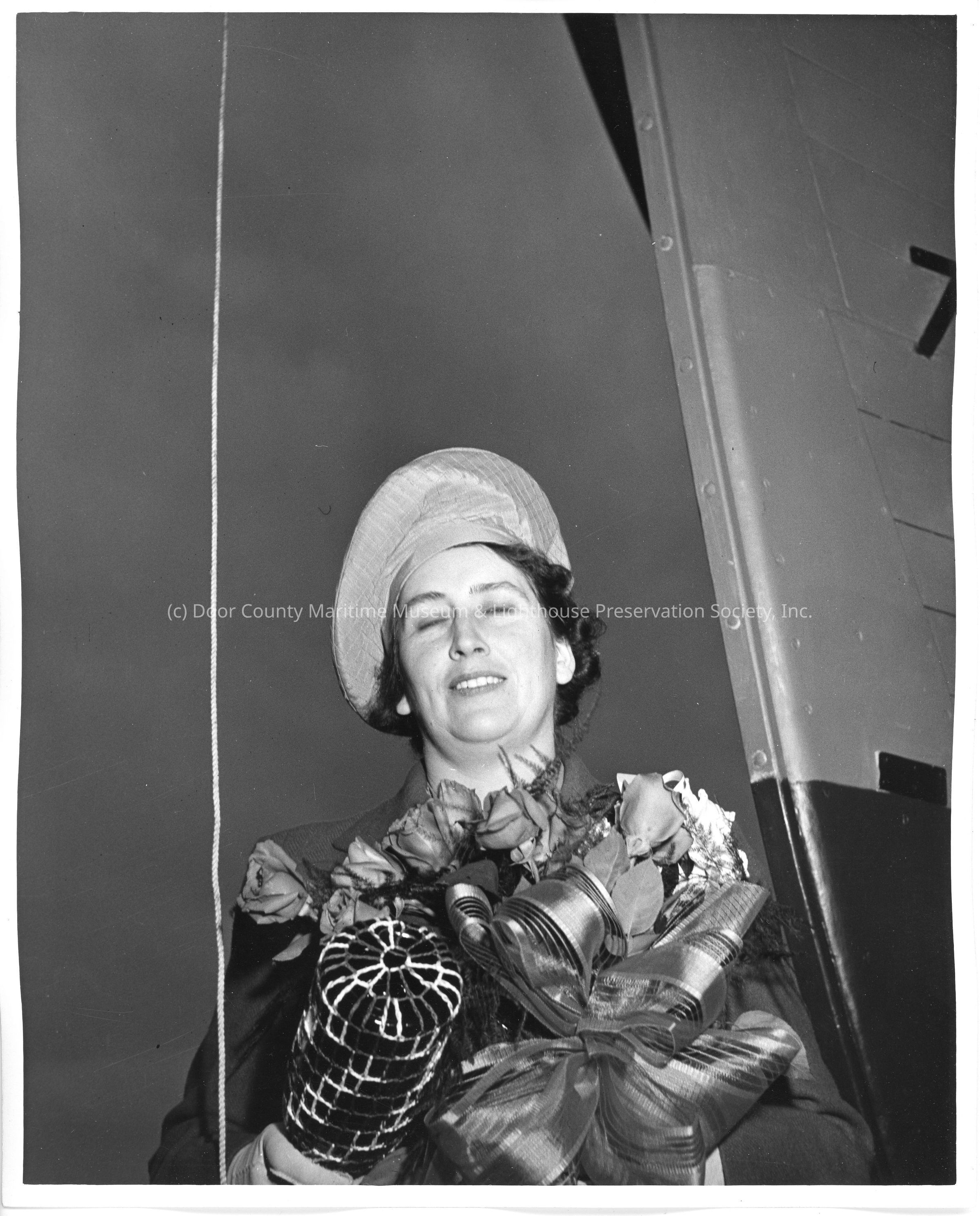 SC-1035 ship sponsor holding flowers and christening bottle pre-christening April 12, 1943Entry/Object ID