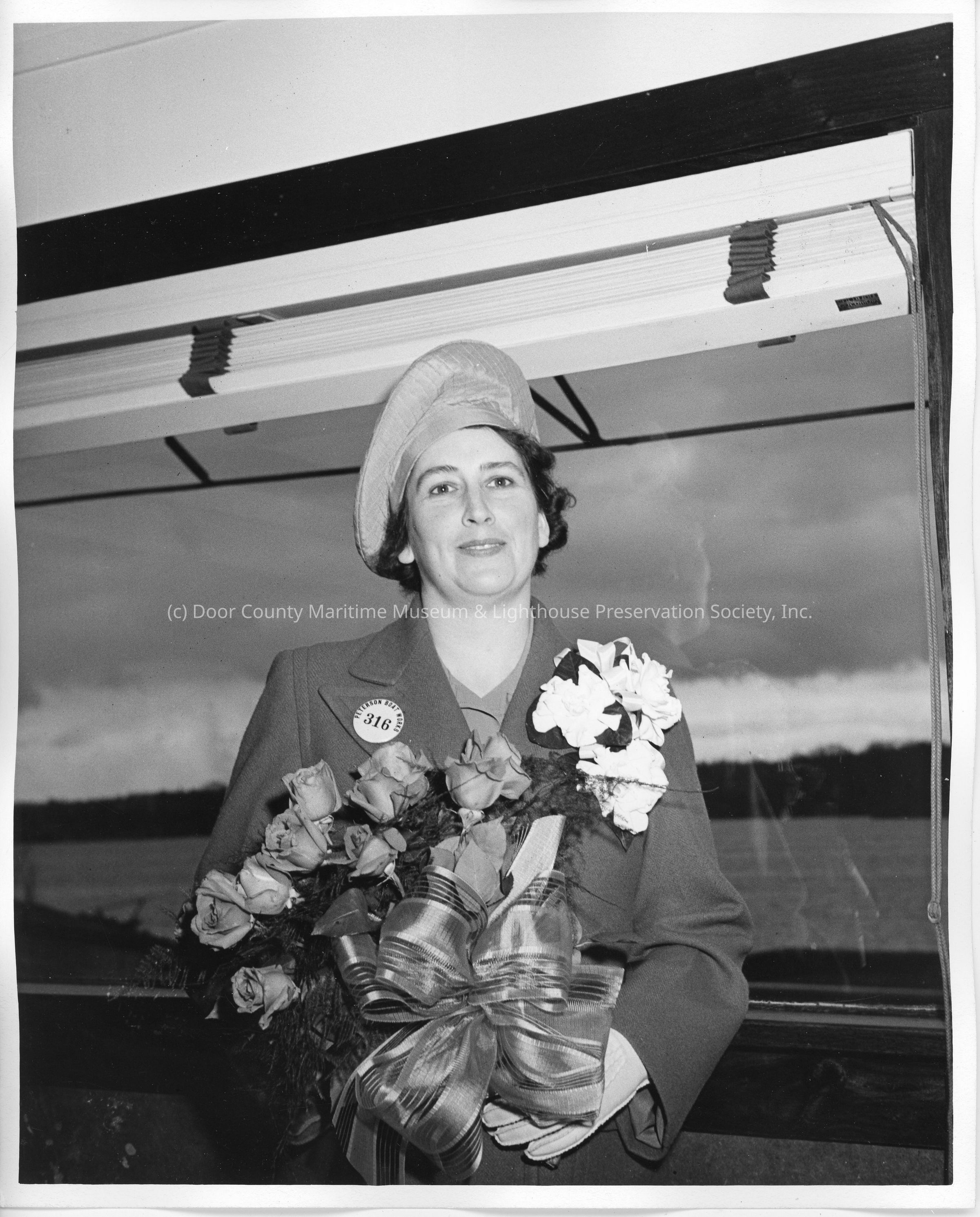 SC-1035 ship sponsor holding flowers in Peterson Boat Works office during christening April 12, 1943Entry/Object ID