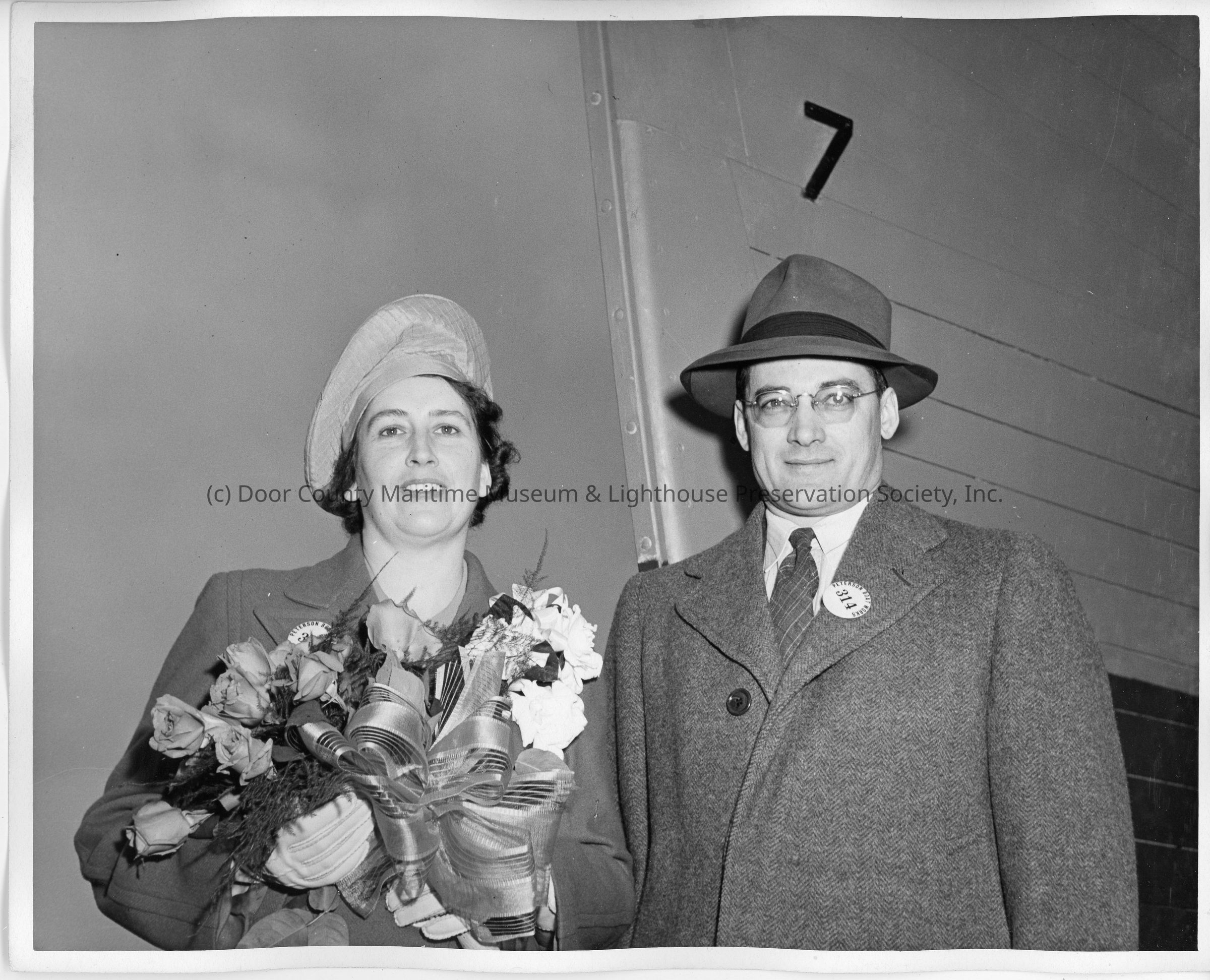 SC-1035 ship sponsor holding flowers next to man in front of ship during christening April 12, 1943Entry/Object ID