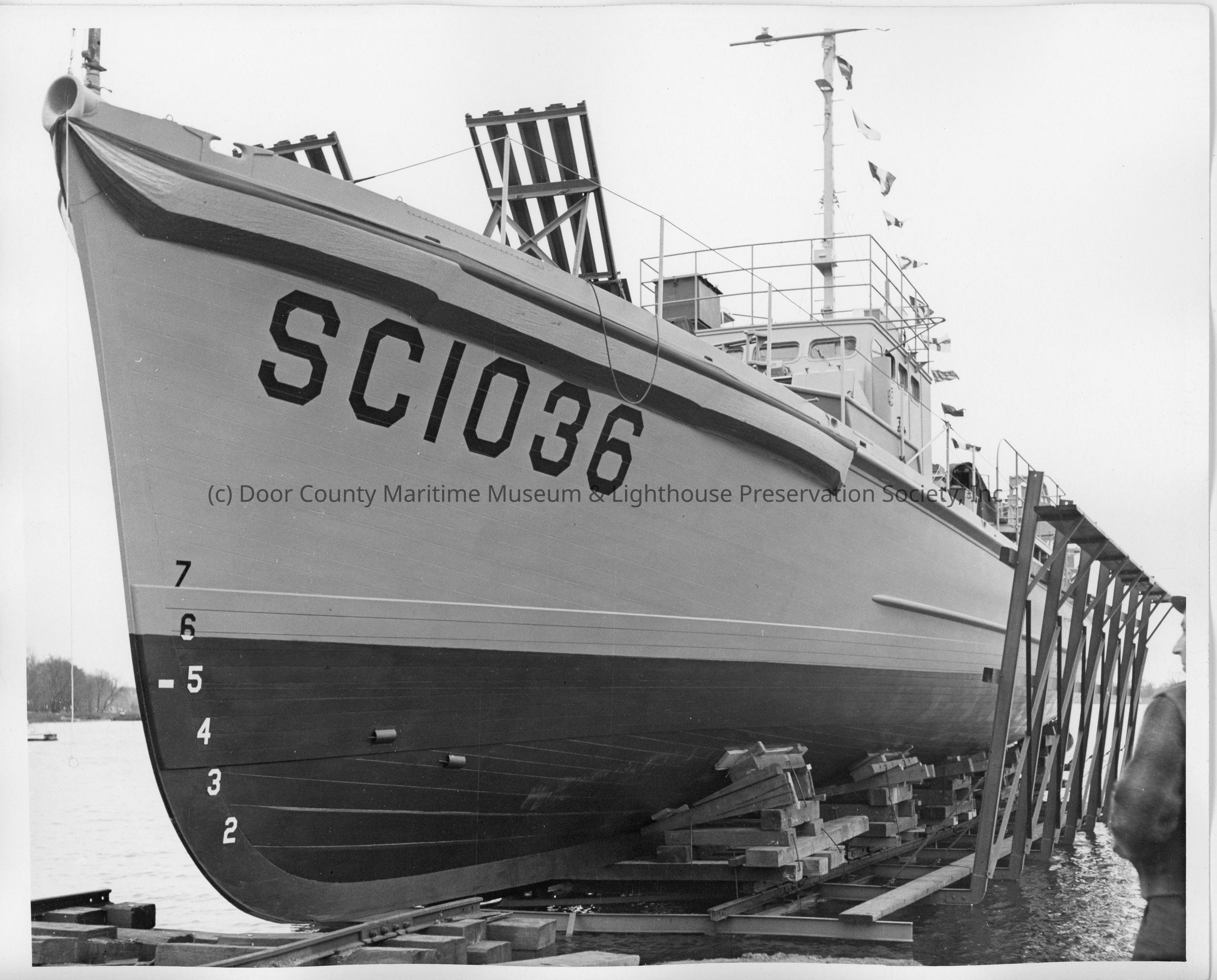 SC-1036 in cribbing pre-launch at Peterson Boat Works May 10, 1943