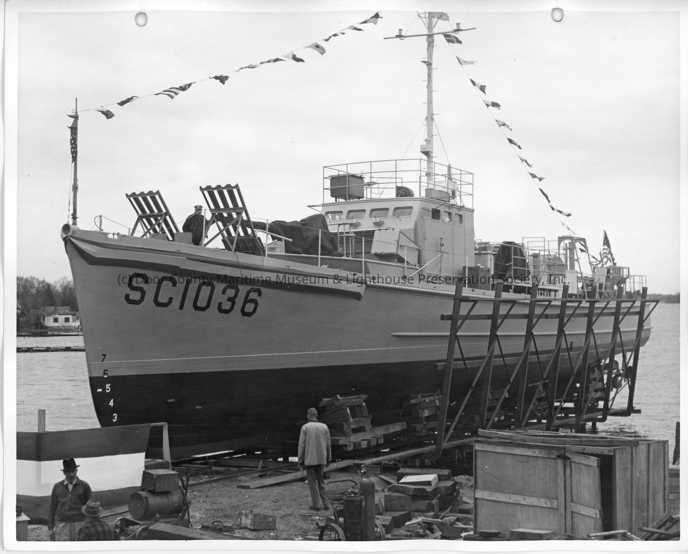 SC-1036 in cribbing pre-launch at Peterson Boat Works May 10, 1943