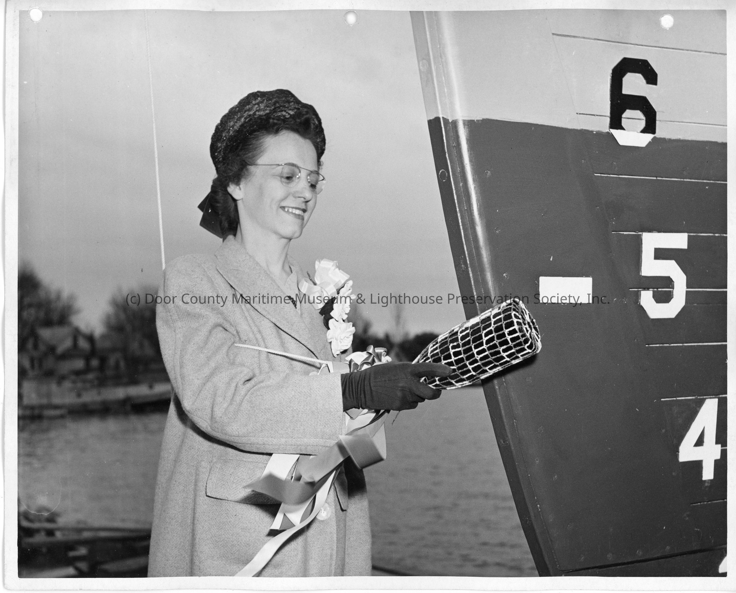 SC-1036 ship sponsor about to christen ship at Peterson Boat Works May 10, 1943Entry/Object ID