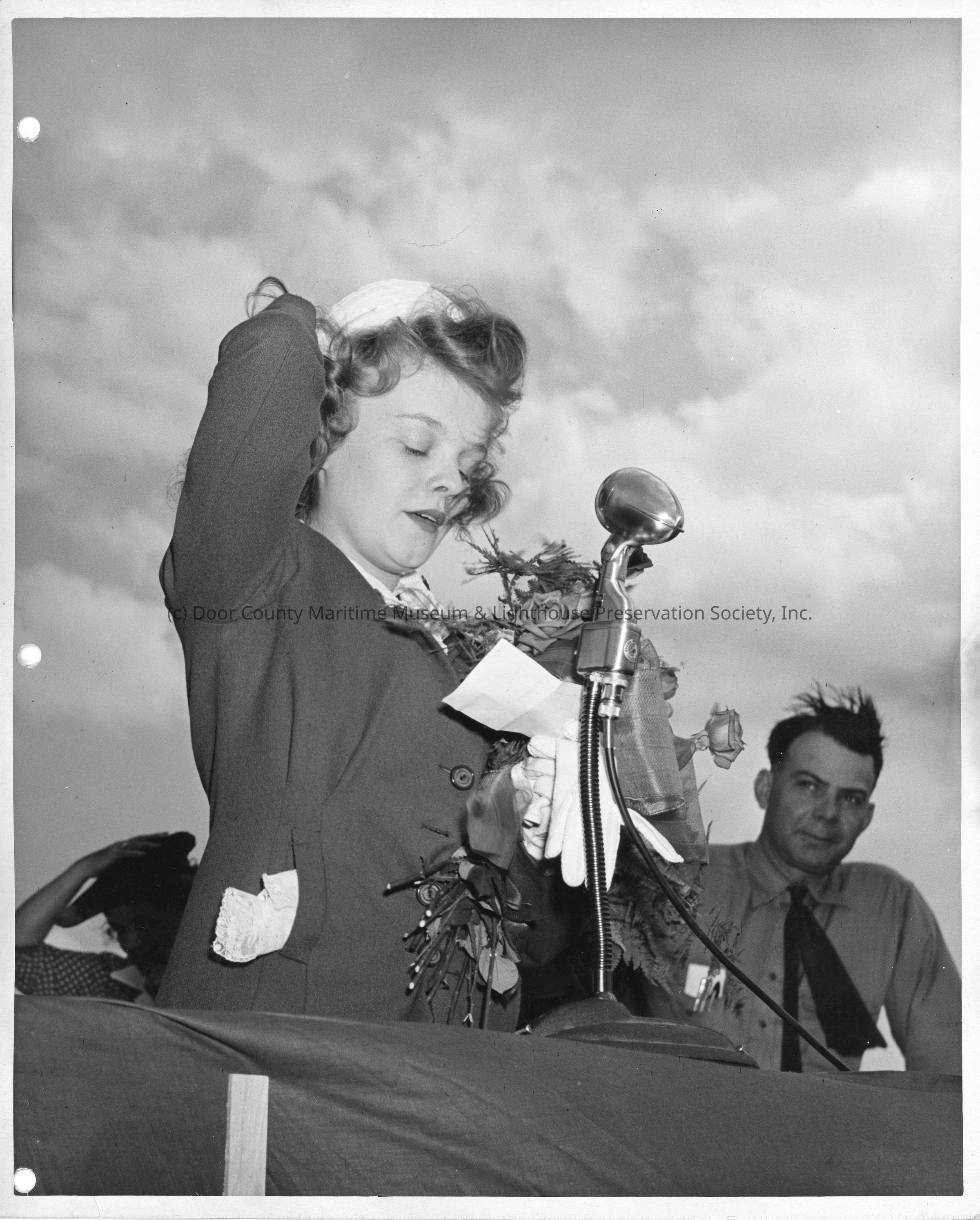 SC-1038 ship sponsor giving speech at ship christening June 12, 1943