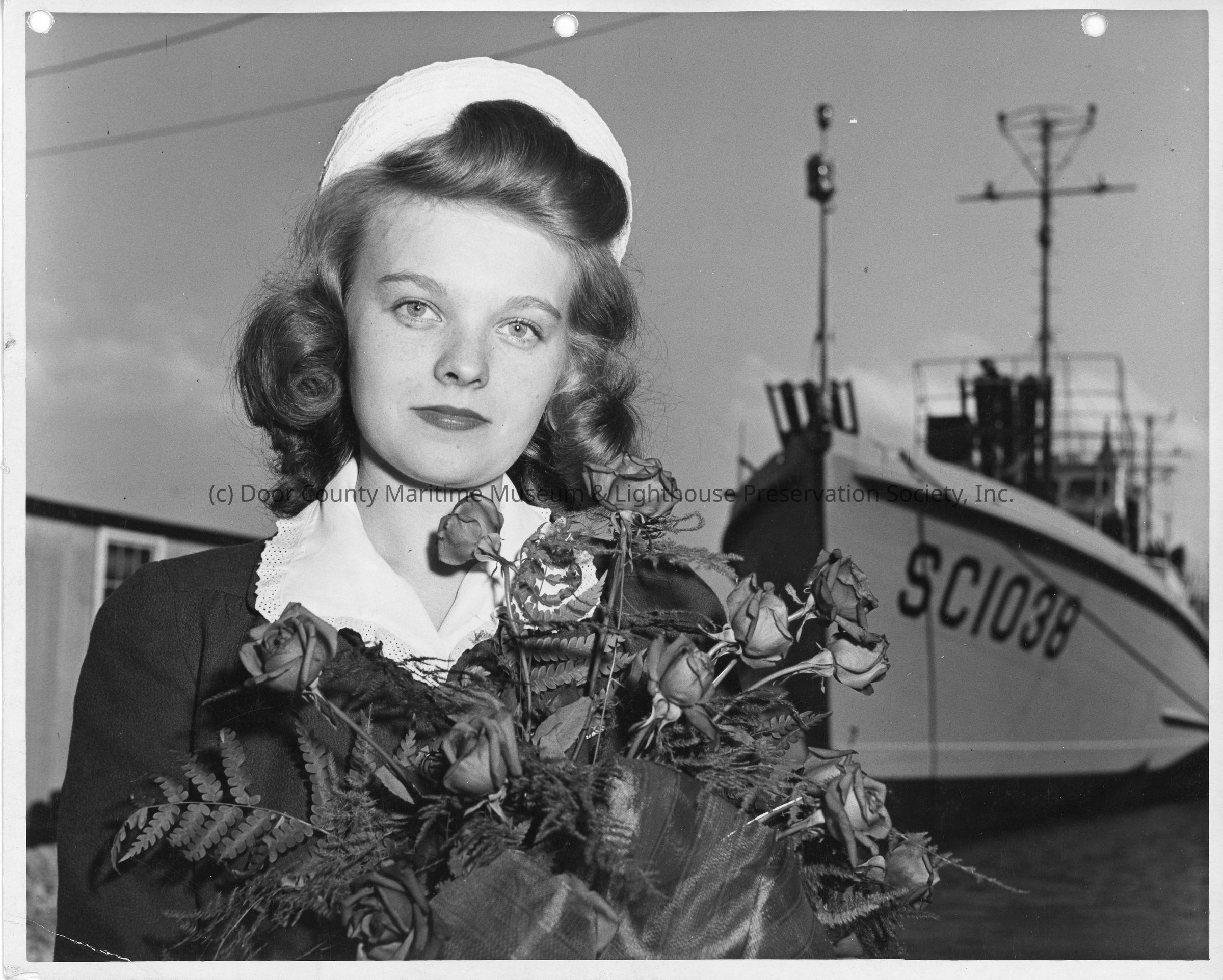 SC-1038 ship sponsor holding flowers at ship christening June 12, 1943