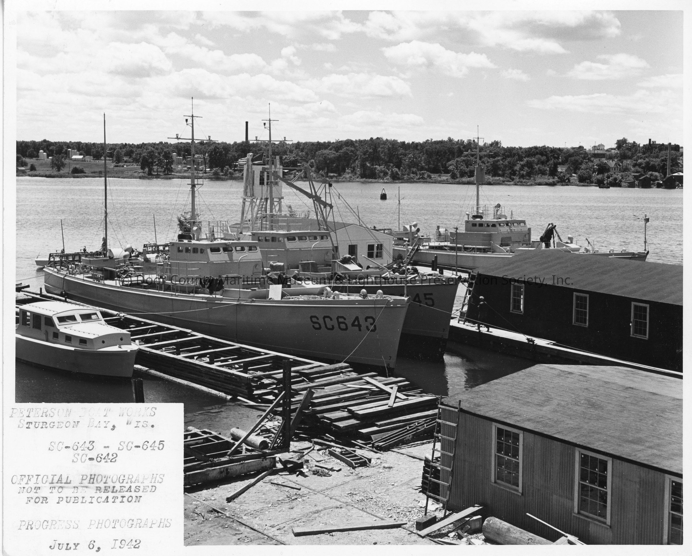 SC-642, SC-643, and SC-645 docked at Peterson Boat Works July 6, 1942