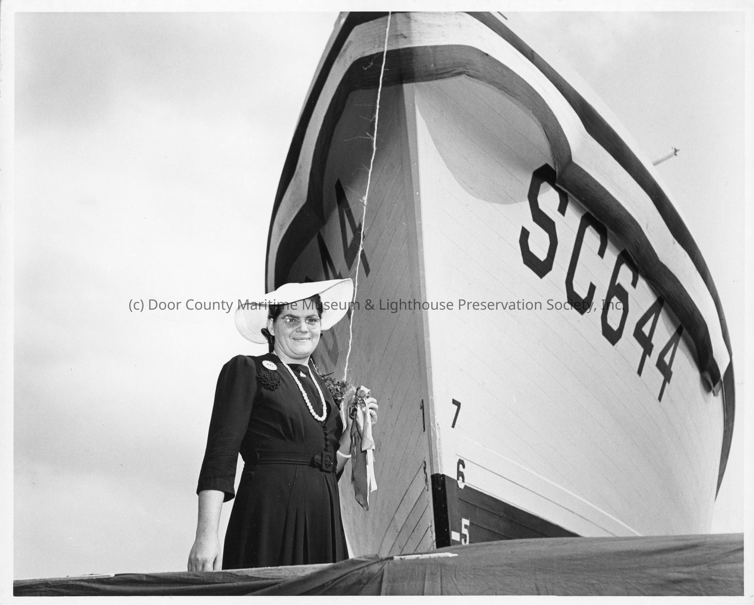 SC-644 ship sponsor holding remains of christening bottle post-christening July 26, 1942Entry/Object ID
