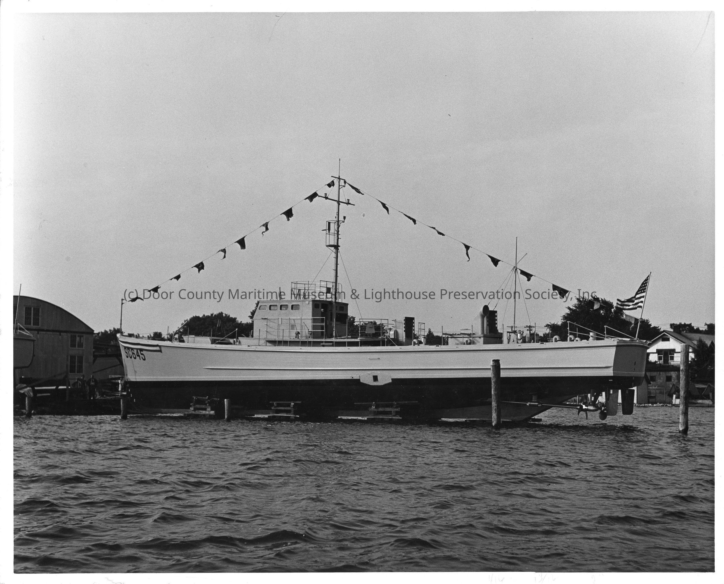 SC-645 on cribbing at Peterson Boat Works June 27, 1942
