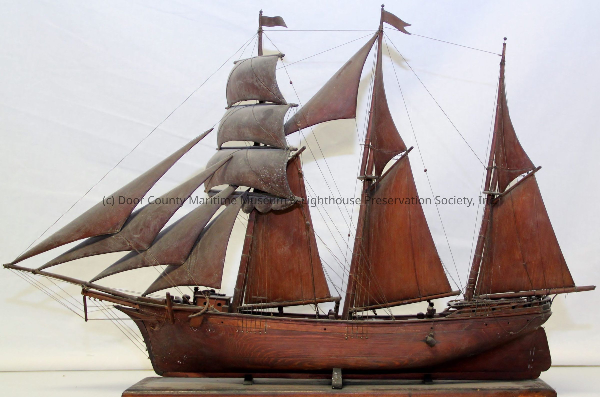 Brown varnish; three masts; flags on top front two masts; "EENA-MARA;" mounted on brown varnished base; lifeboat at rear of base