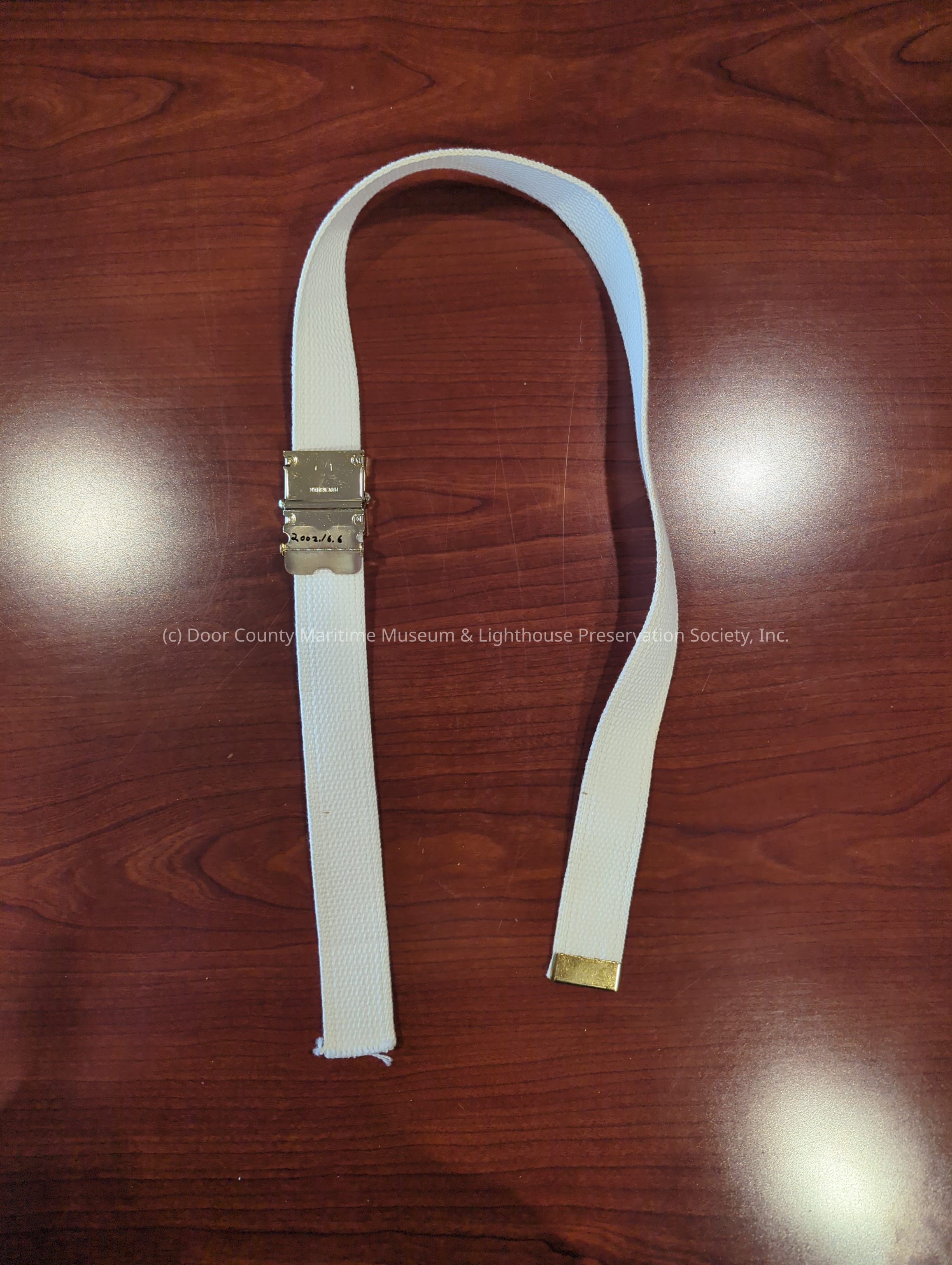White fabric with gold metal buckle. Gold metal strip on one end