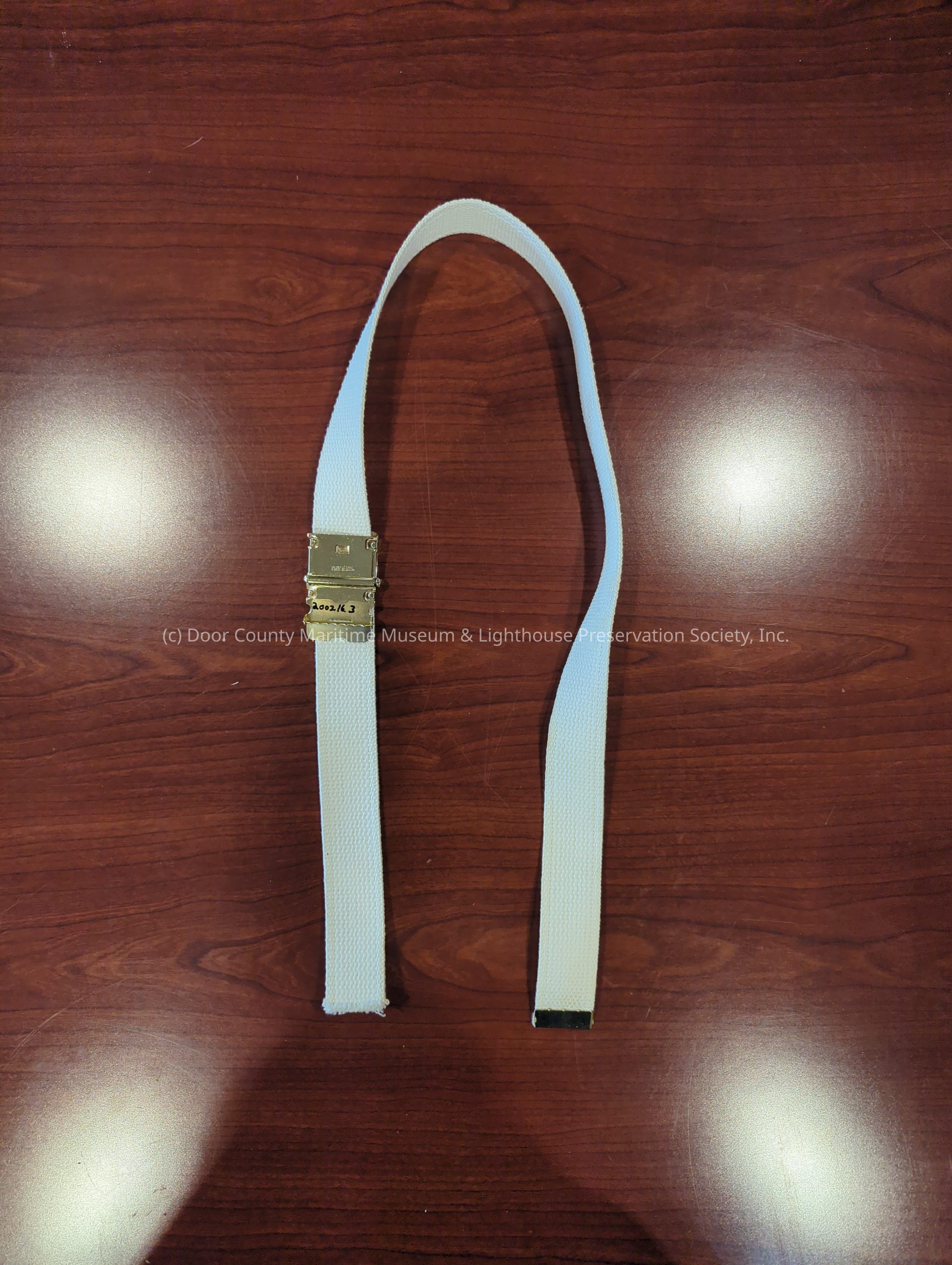 Buckle, belt (four); 3,4,5,6 white fabric; gold metal buckle, gold metal strip on one end; used with Sea Scout uniform.Location