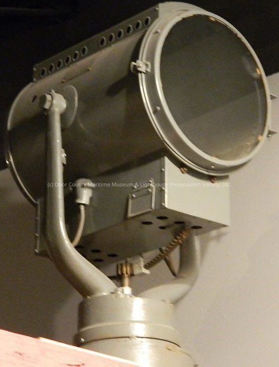 Searchlight (carbon arc) mounted on a block wood stand; CF & name on plate on end; plate on side - name, place, No. 181314, volts 110, amp 25, date 1950; gray painted metal; cylindrical light with glass at front; hinged to open; has wires from stand to light on both sides; mounted on a stand and base which rotates up and down in an arc with a gear arrangement; has a silver lever and brass-colored knob at back; top hood with circle vents.Location