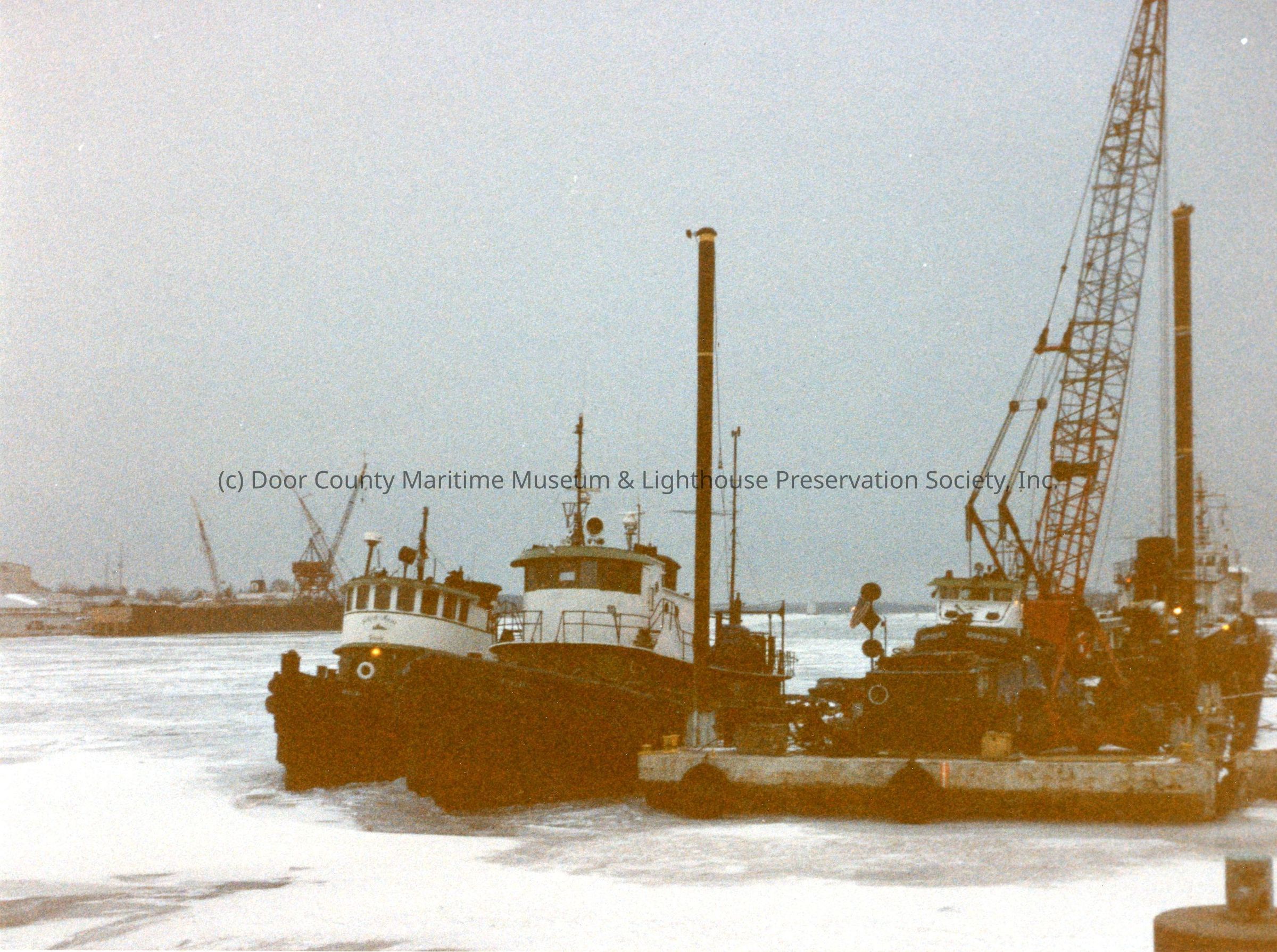 Selvick Marine Towing Co. tugs and dredge in Sturgeon Bay 1989