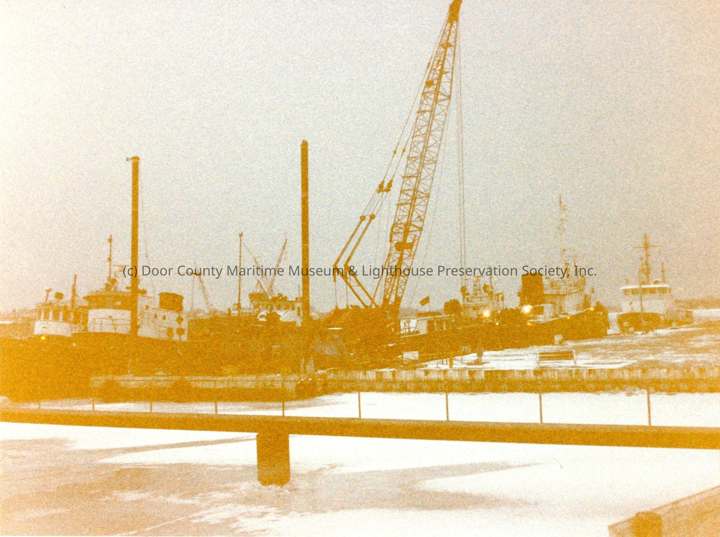 Selvick Marine Towing Co. tugs and dredge in Sturgeon Bay 1989