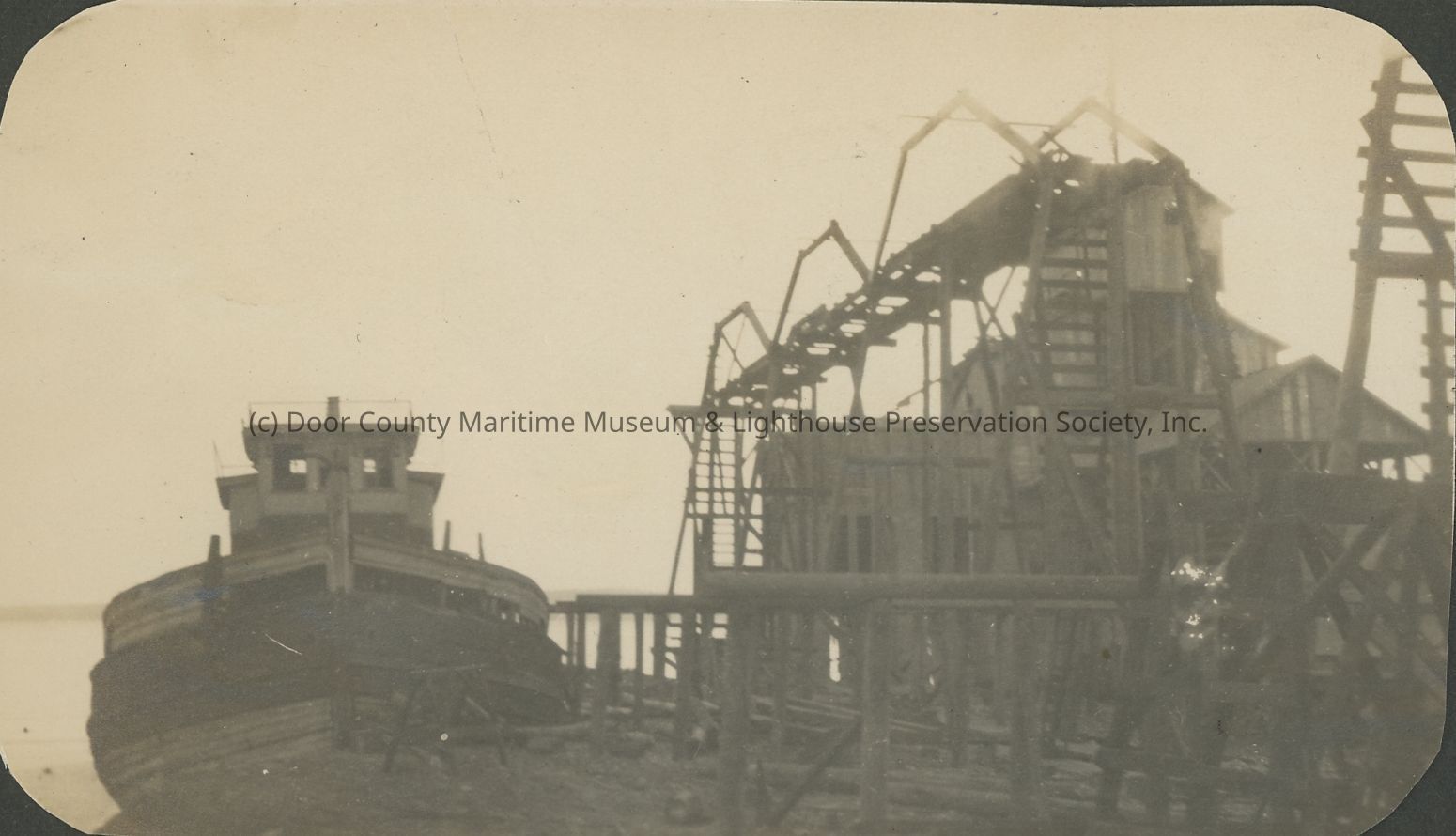 Unidentified ship at quarry dock with trestle at right.