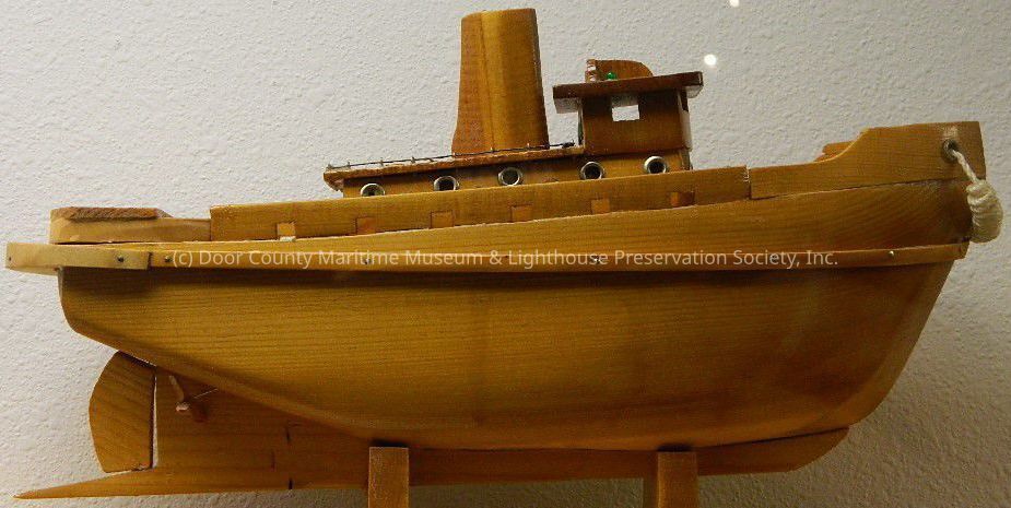Name on tag on base- Fritz Brunswick- also on attached wood plaque on wood tug boat; varnished clear and a darker clear; three pilings with rope