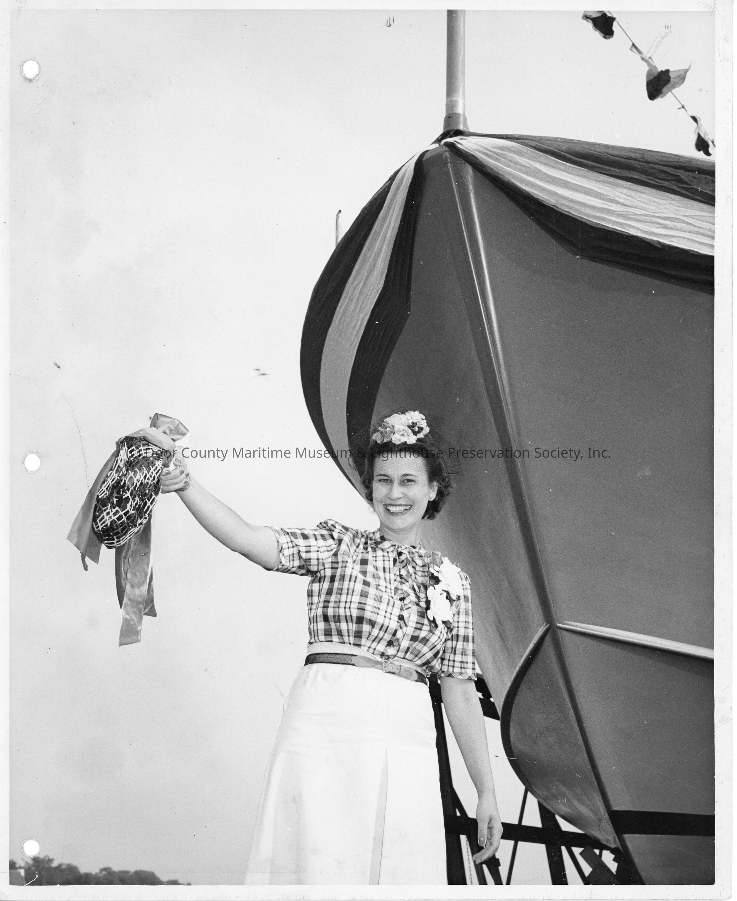 Ship sponsor holding christening bottle for P-573 post-christening September 11, 1944Entry/Object ID