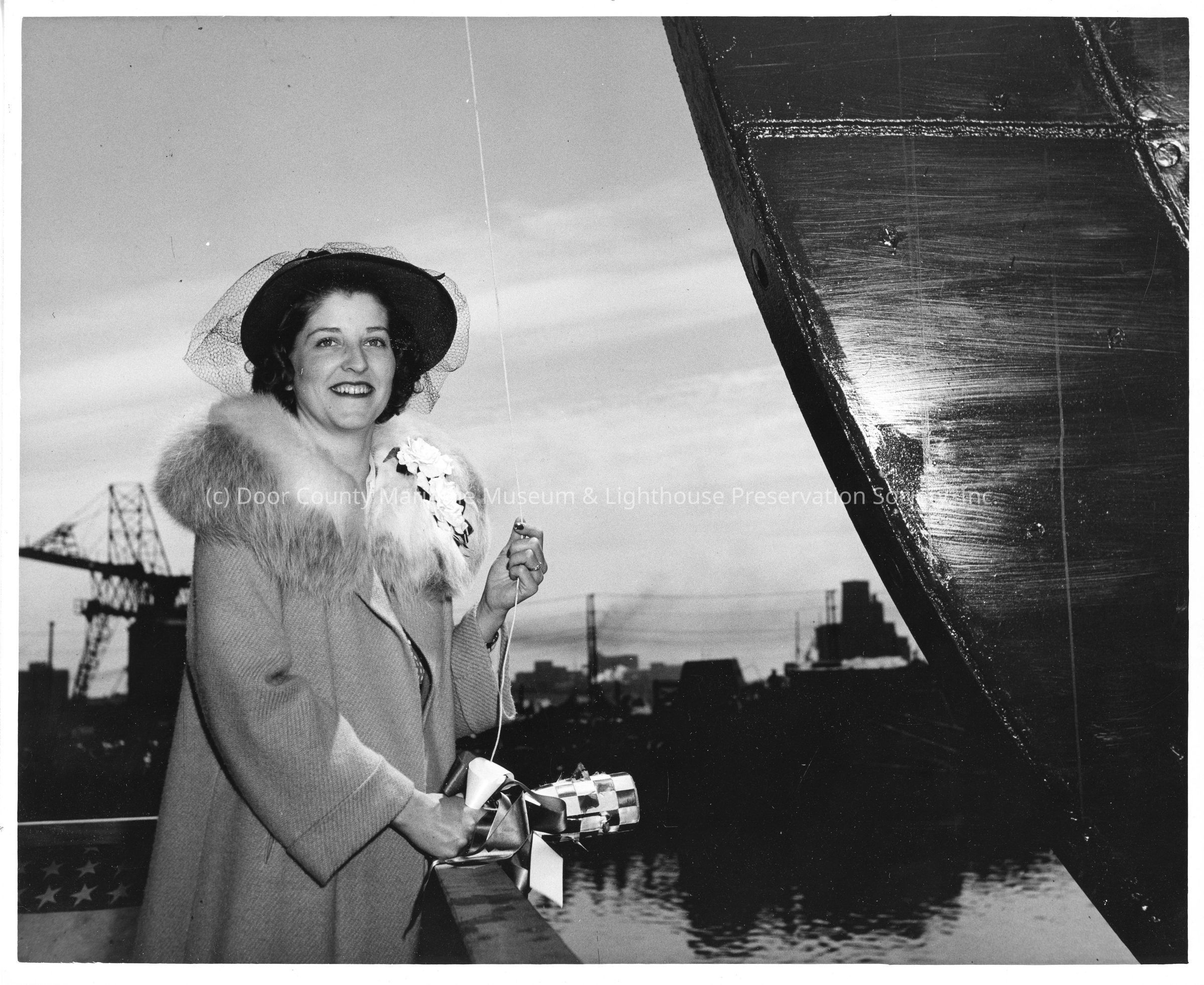 Ship sponsor holding christening bottle pre-christening