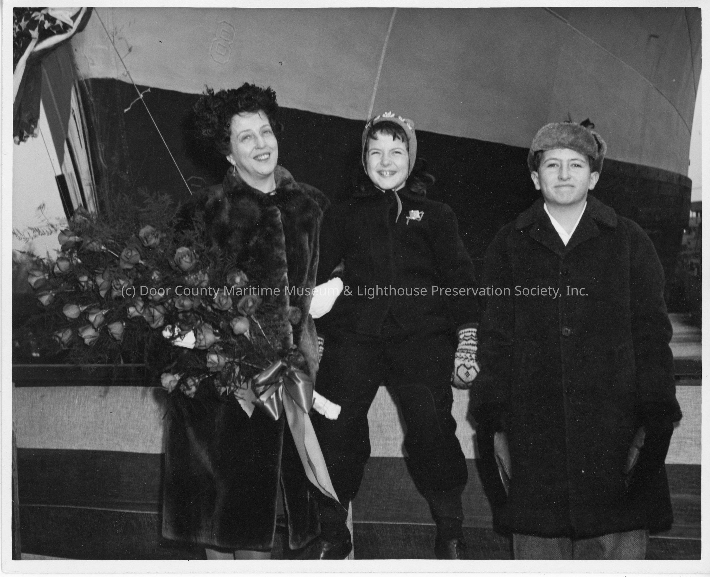 Ship sponsor holding flowers alongside two children at christening