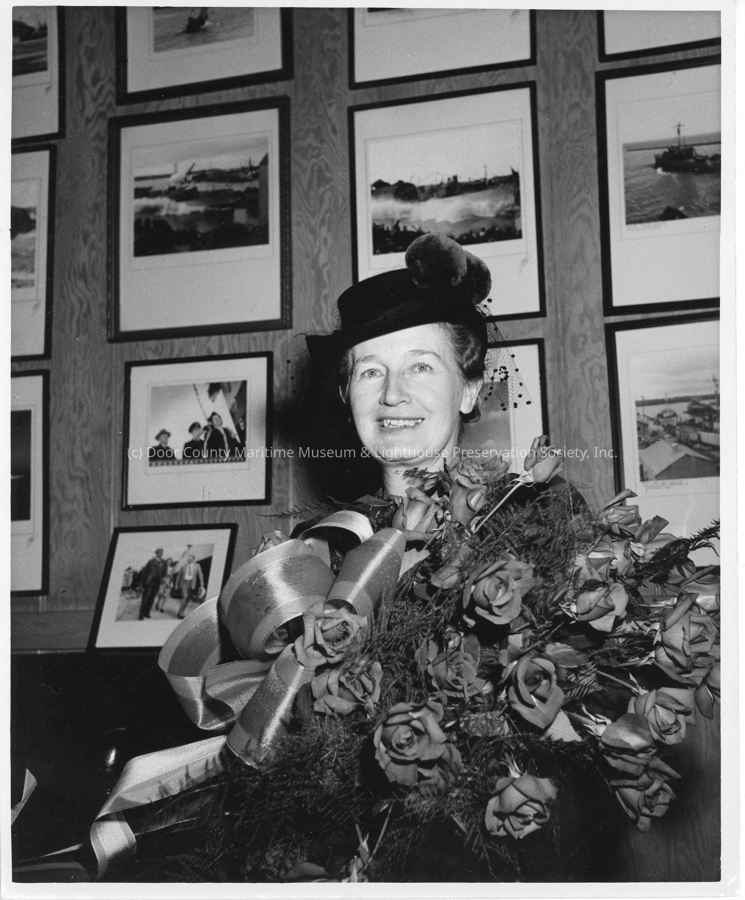 Ship sponsor holding flowers at christening