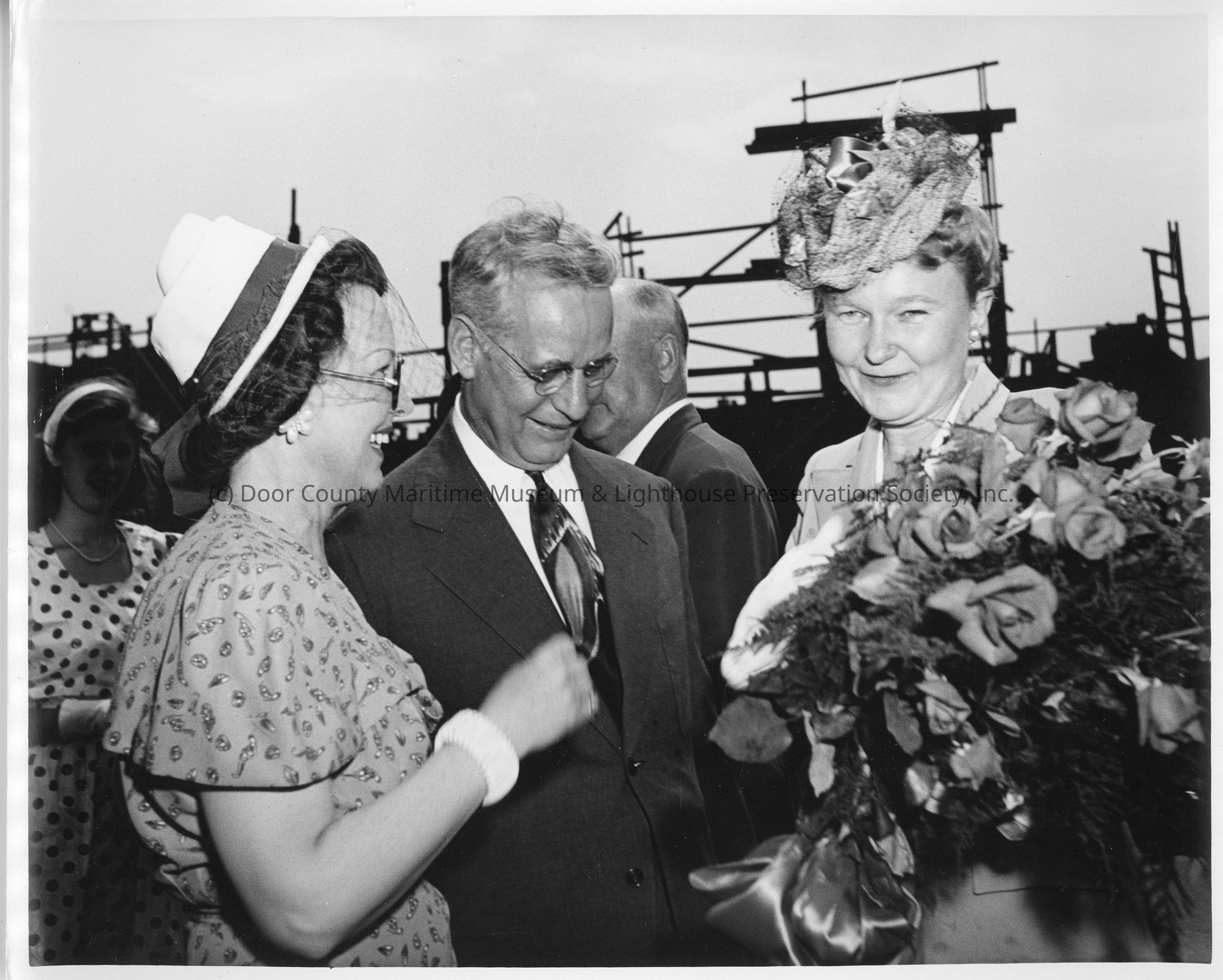 Ship sponsor holding flowers with group at christening of AK-220 WexfordEntry/Object ID