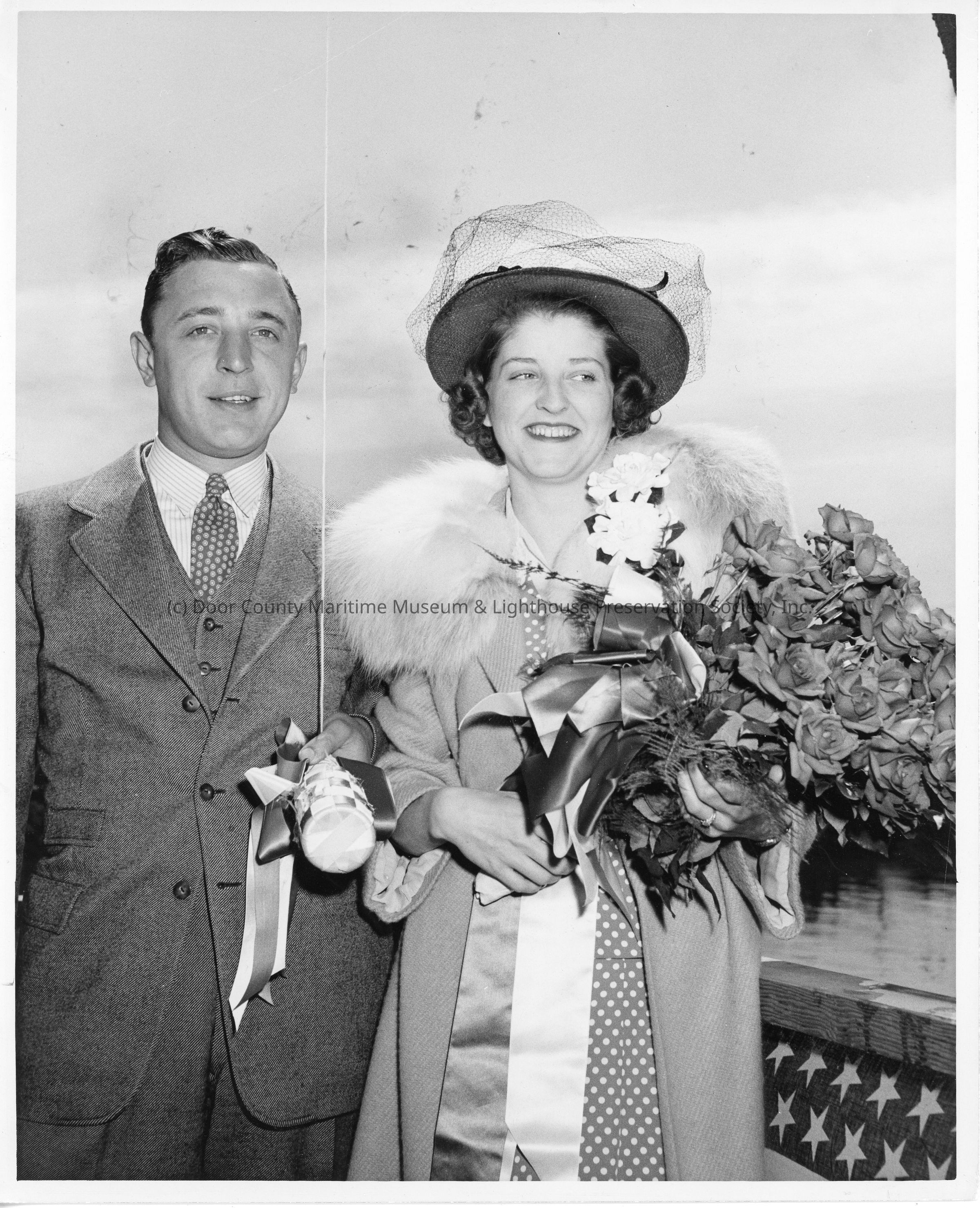 Ship sponsor holding flowers with spouse holding christening bottle pre-christening