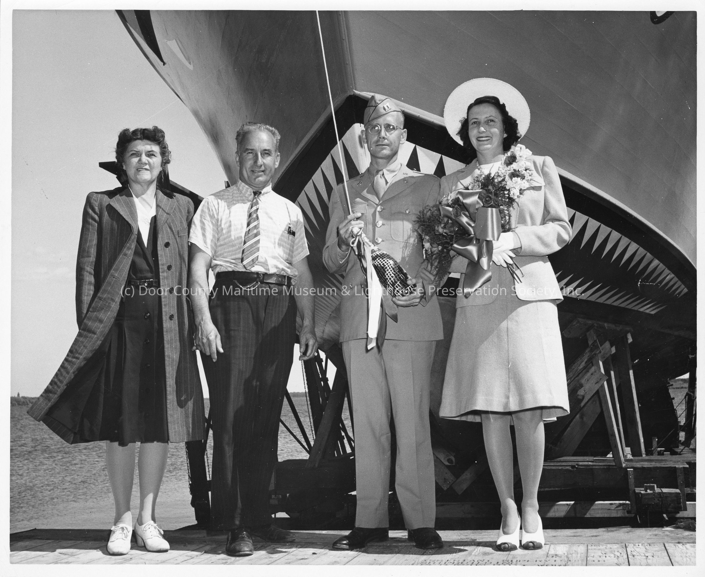 Ship sponsors bosing with christening bottle at christening of P-571 at Peterson Boat Works July 15, 1944Entry/Object ID