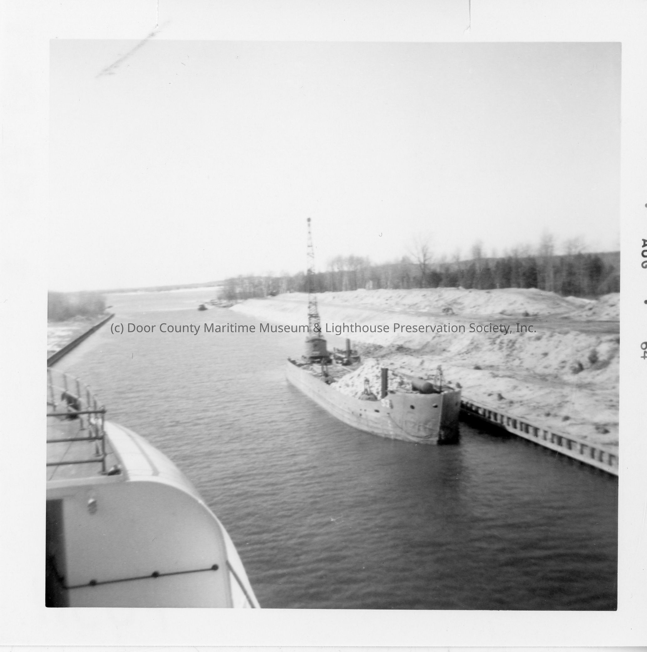 Ship with a load of stone and a crane underway in canal August 1964