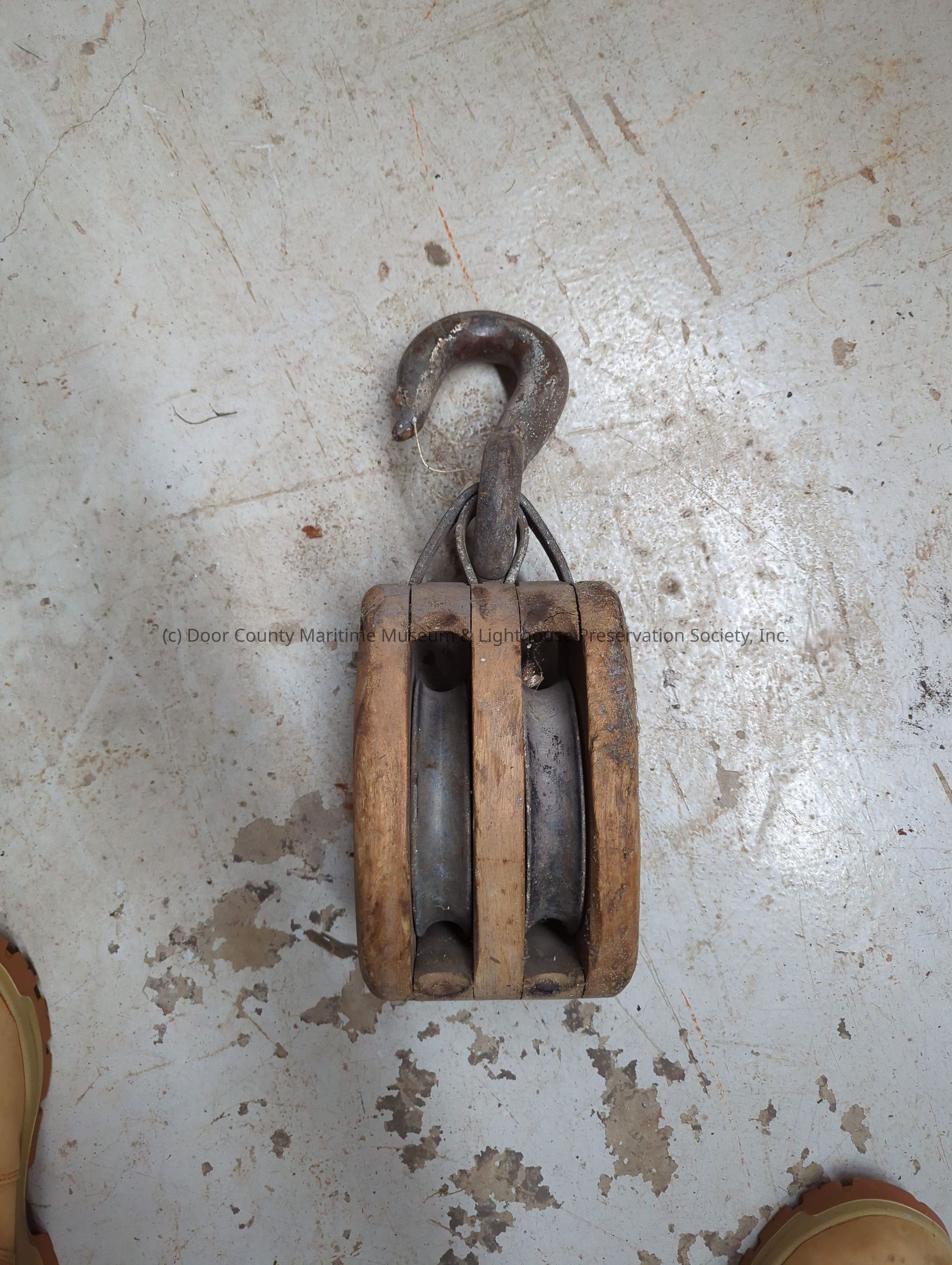Double block with wooden frame. Metal hook on top with metal bars keeping the hook in place