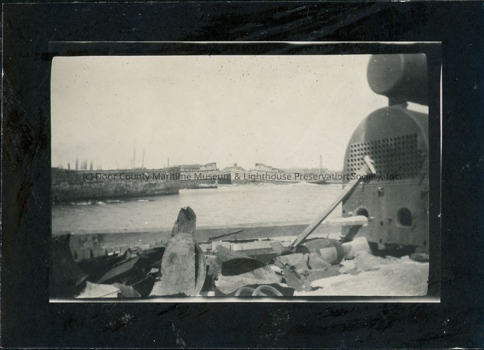 Ship's boiler on shore in Sturgeon Bay. Tugs are visible docked farther down the shoreline, as well as a hull of an unidentified ship.Location