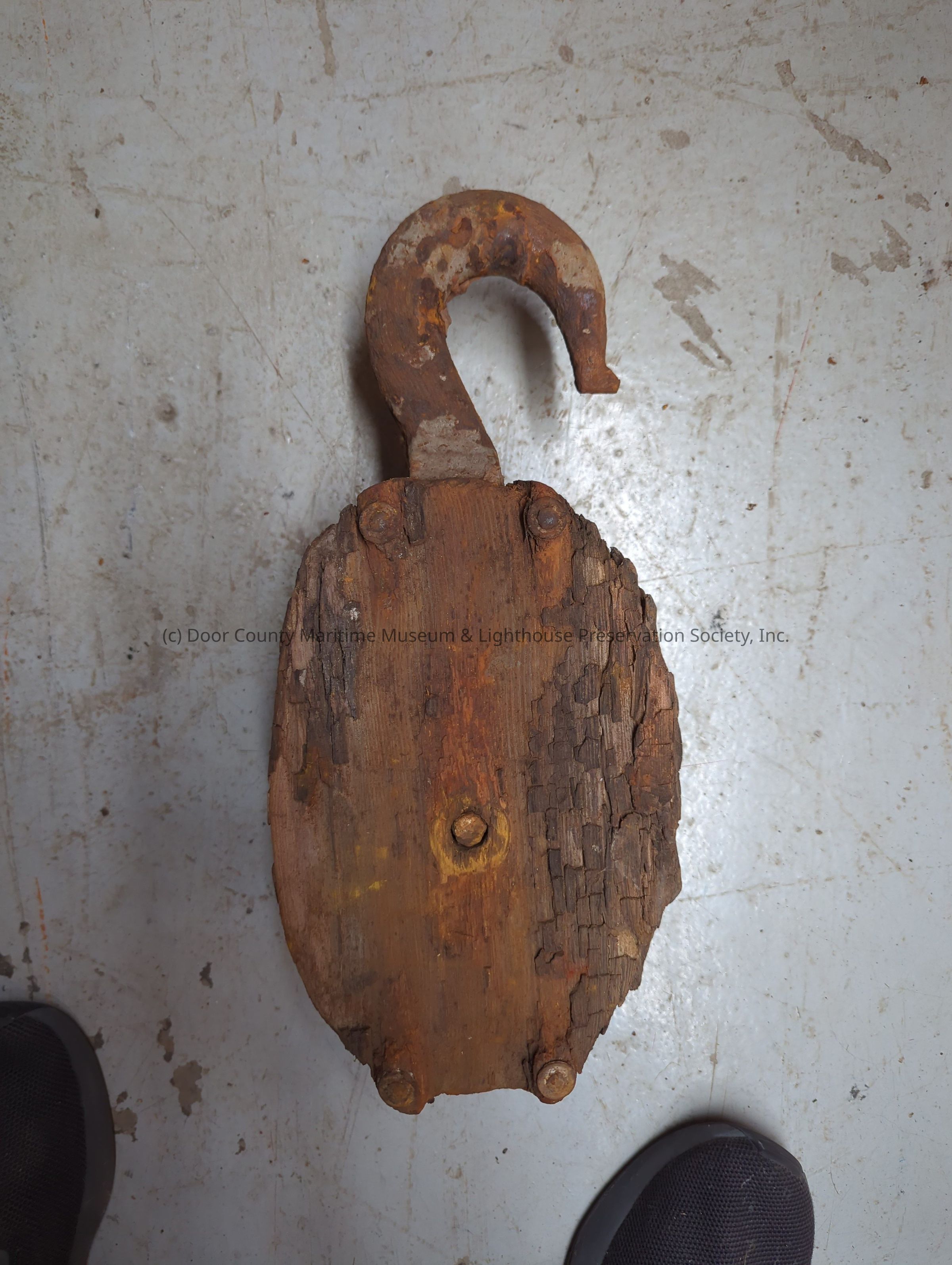 Single wooden block and sheave. Rusty metal hook on top.