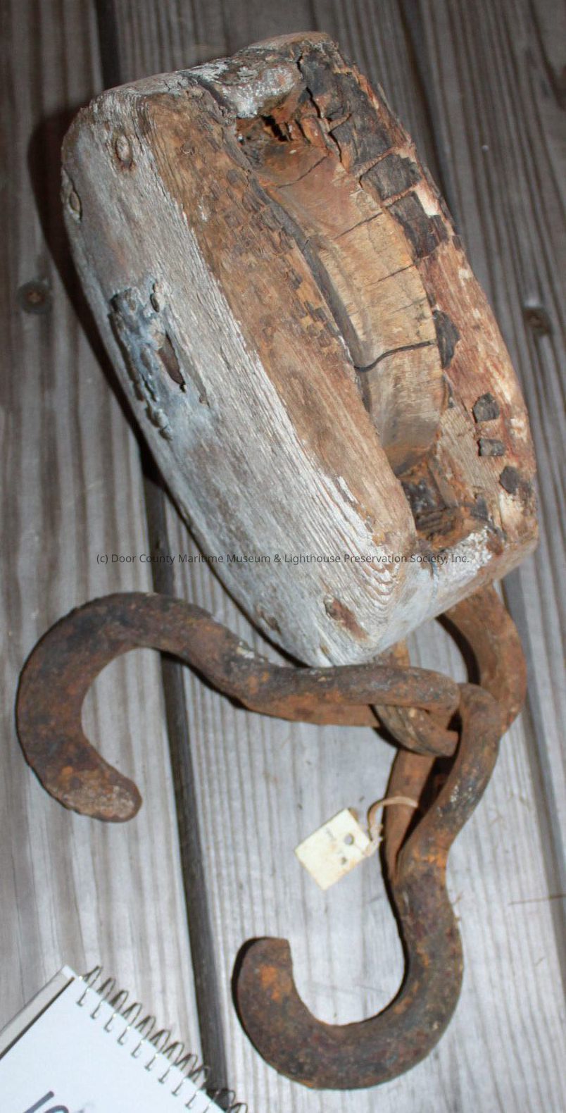 Wood block and shiv. Very dry and damaged. Two hooks attached to one end.