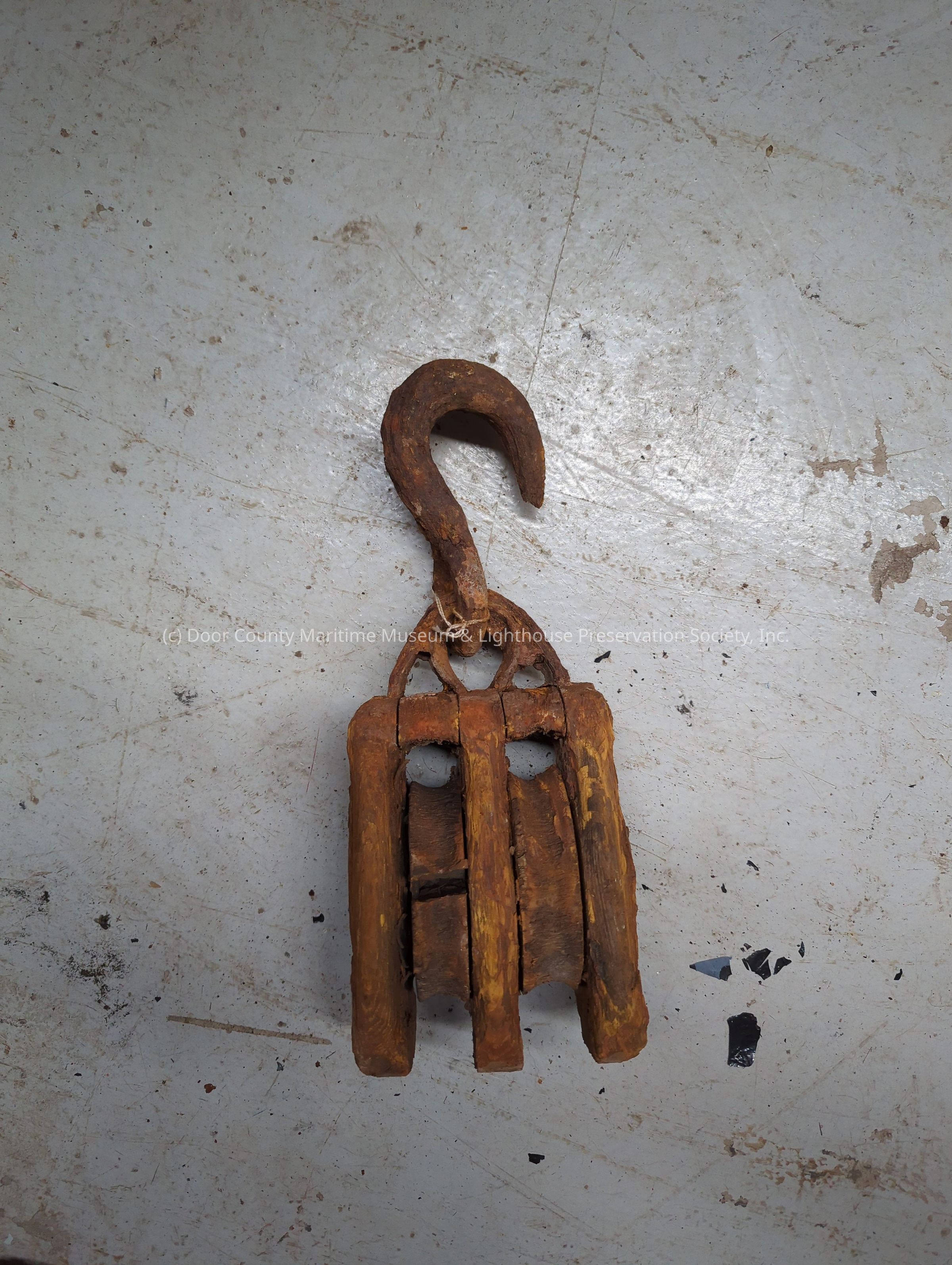 Double wood block sheaves are made of wood. Rusty metal hook