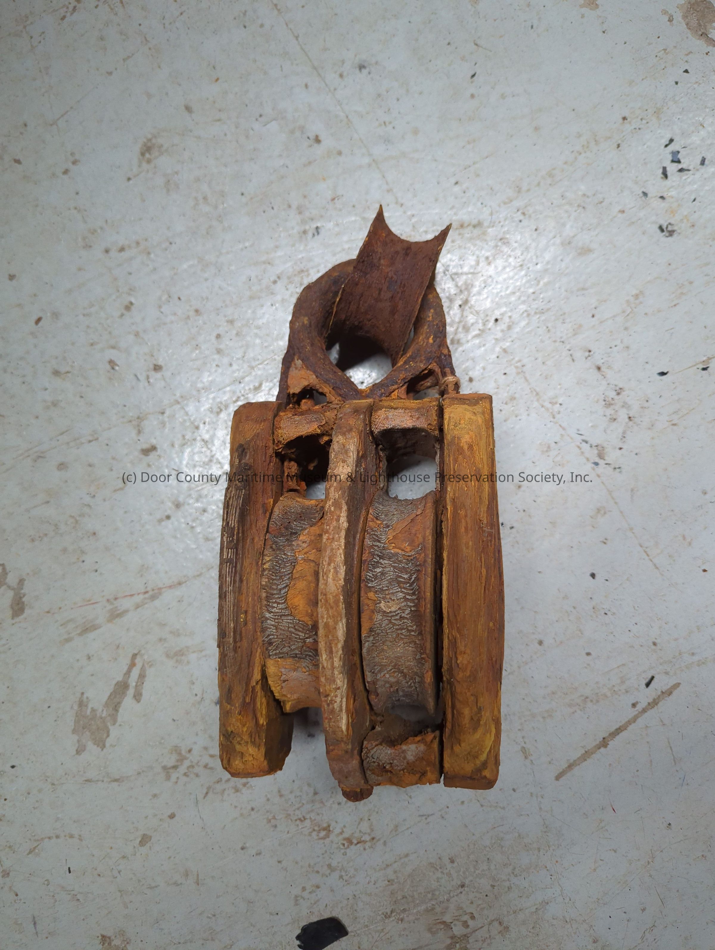Double block with wooden sheaves. Metal loop on bottom. Rusty
