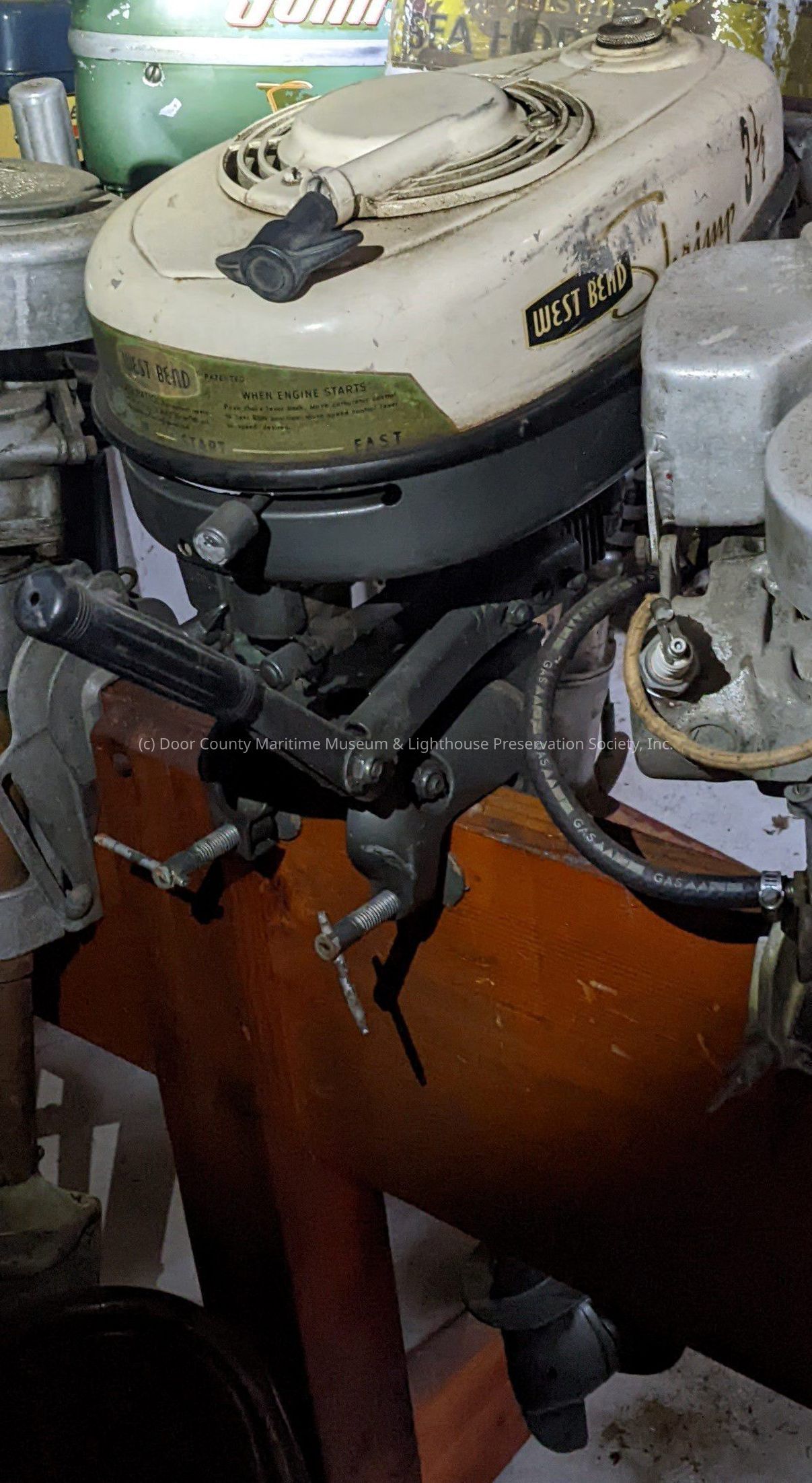 West Bend Shrimp outboard motor. White, gold, and black in color