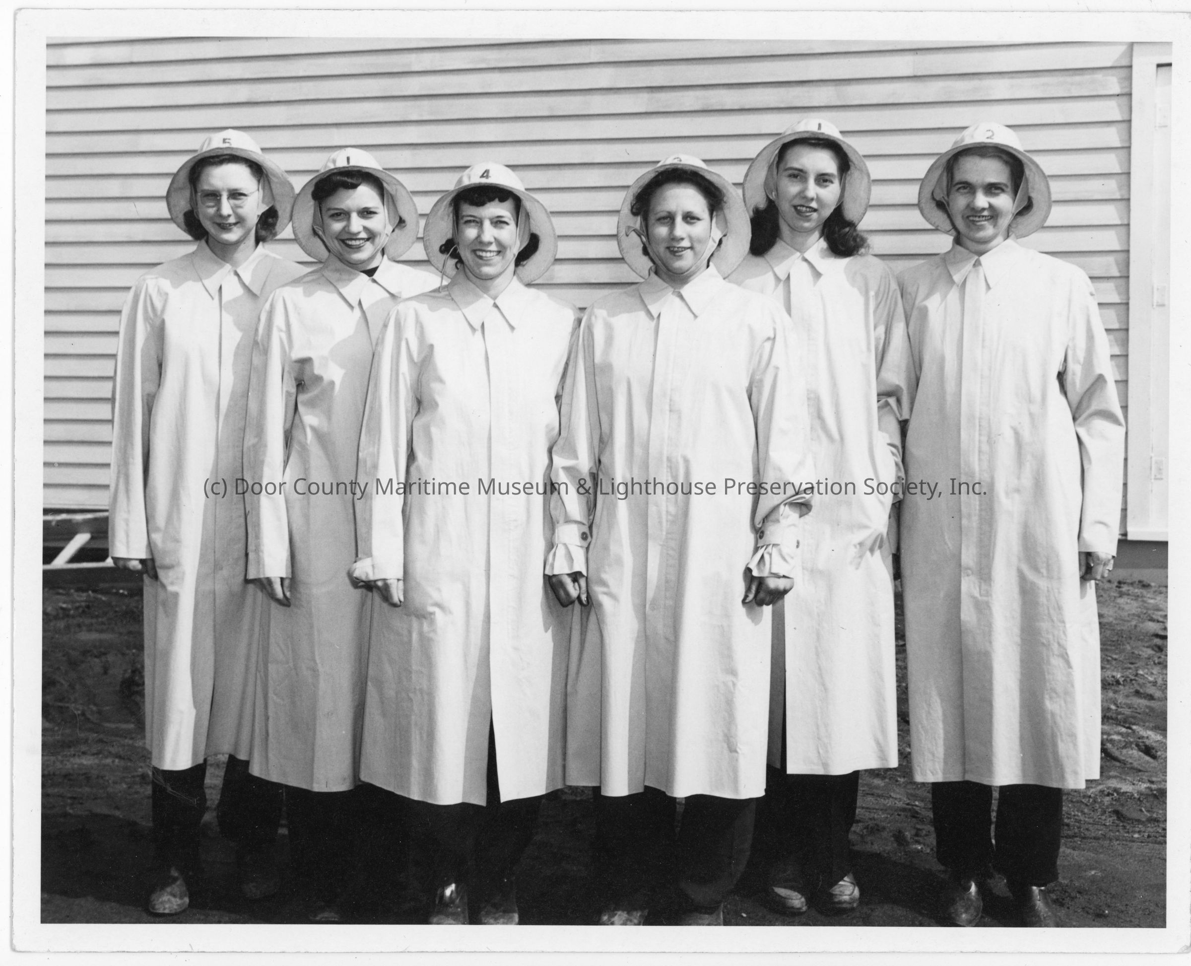 Six women in rain coats and caps