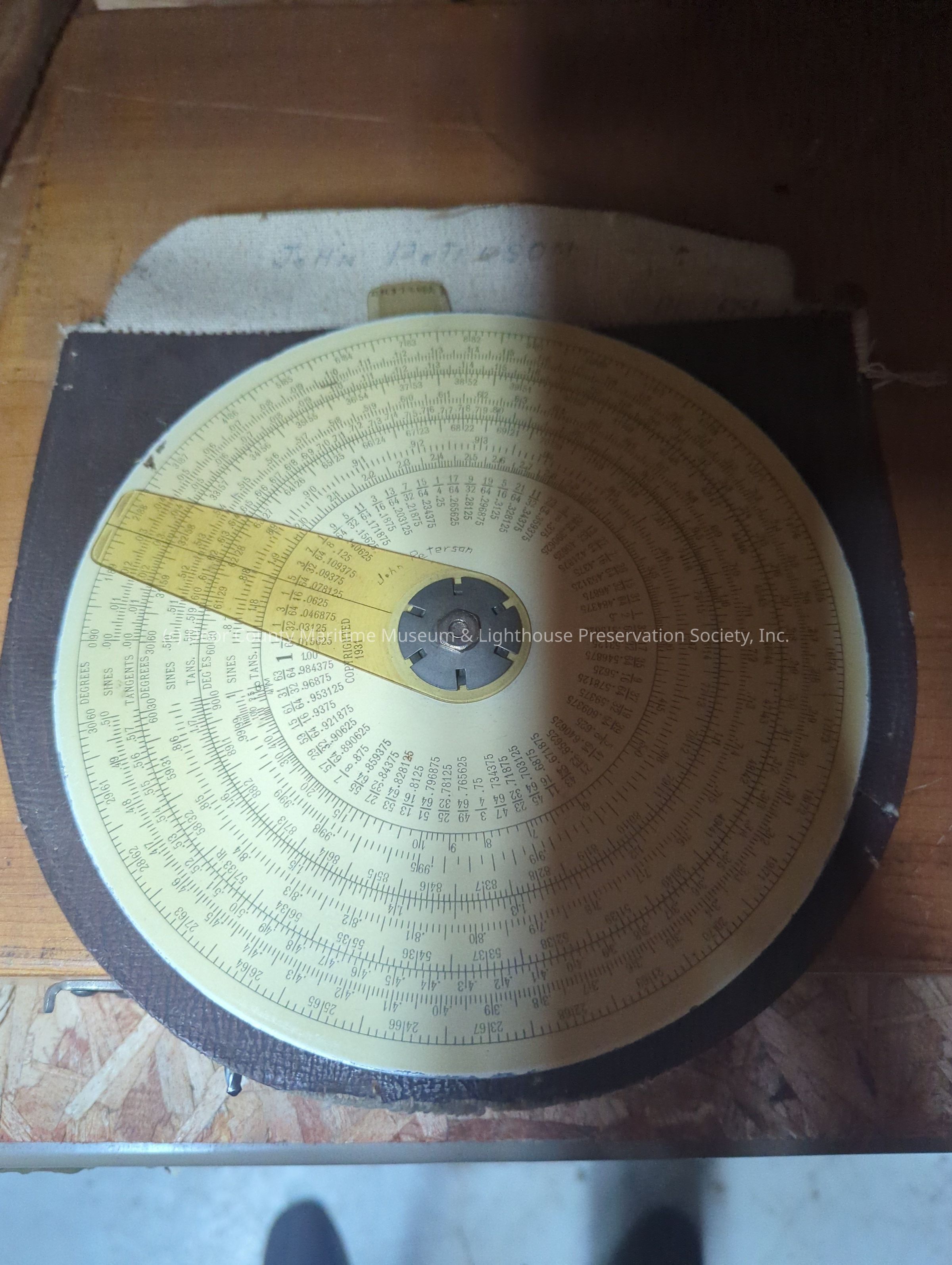 Yellowish metal slide rule. Measuring device on front and back. "John Peterson" carved on center. Contained in leather pouch with flap over the top