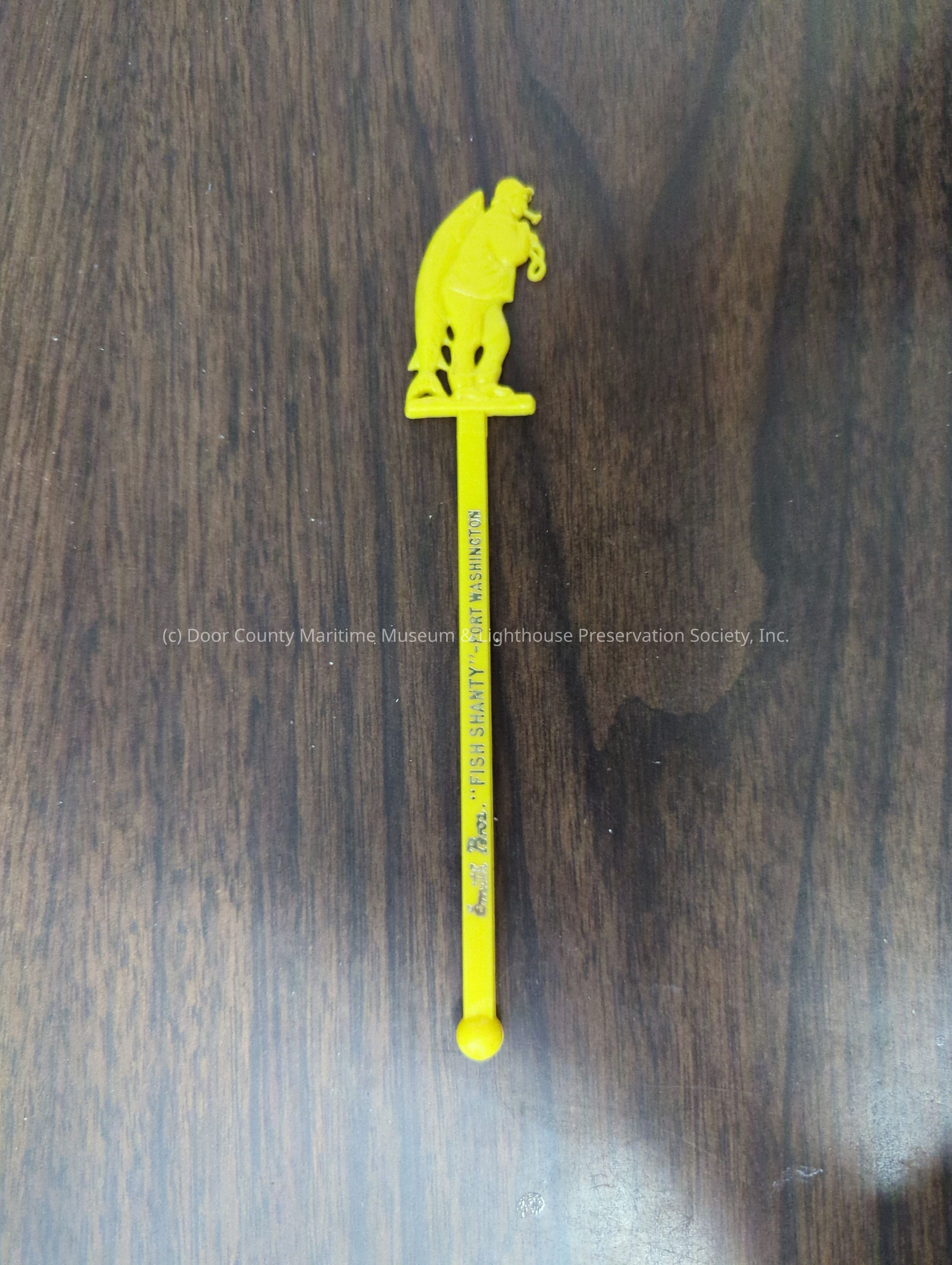Plastic stirrer with fisherman on top. Yellow with gold text