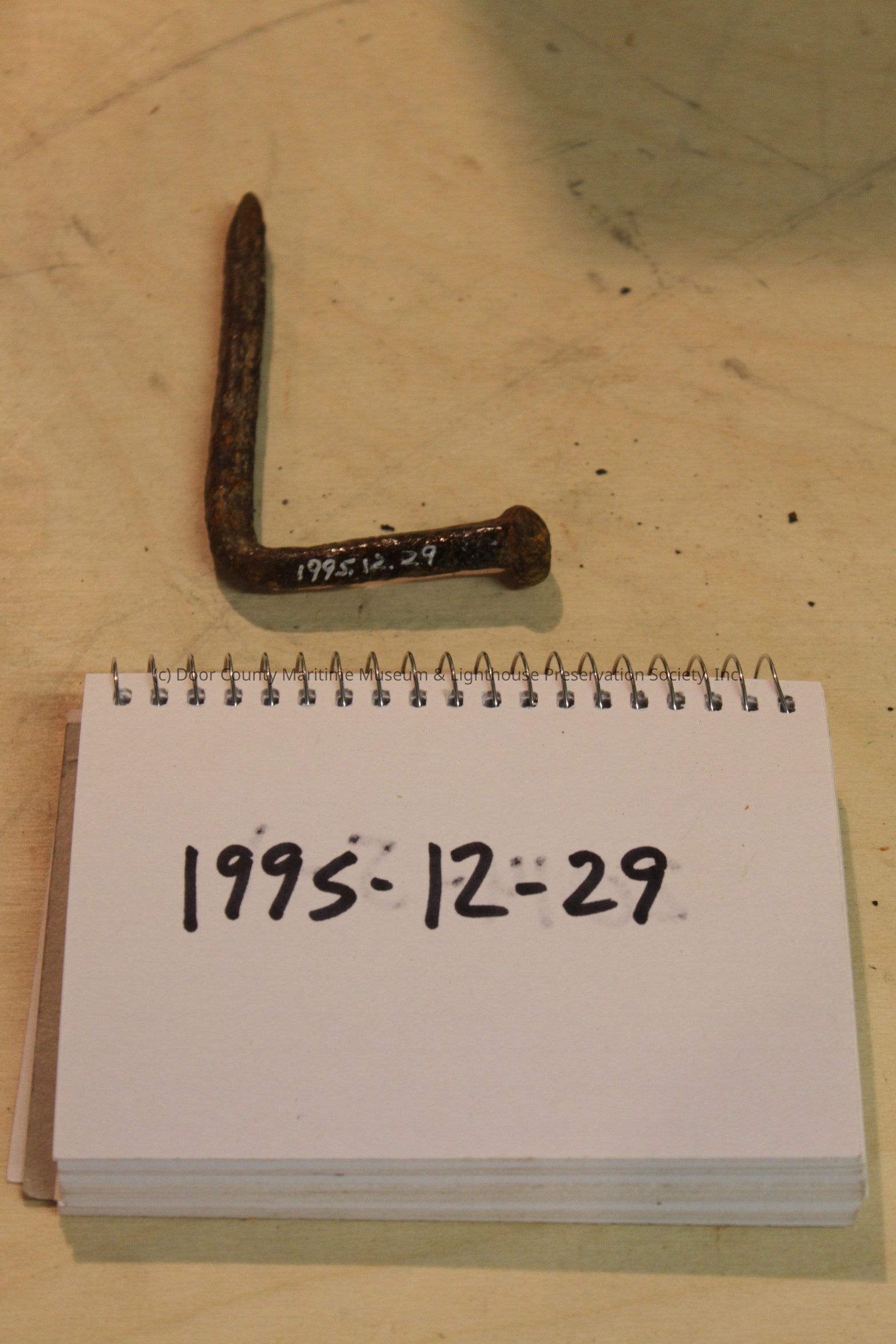 Square nail, bent 90 degrees, tapered one end rounded other.